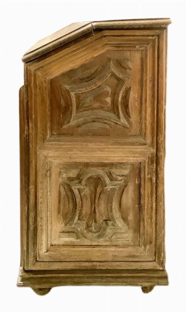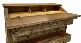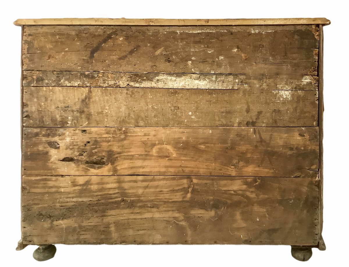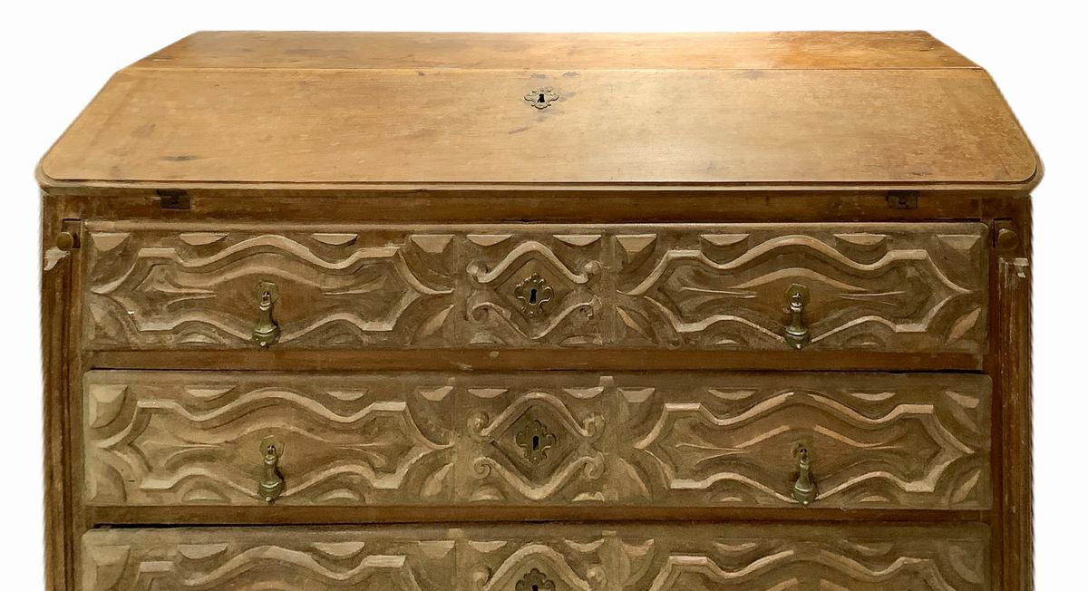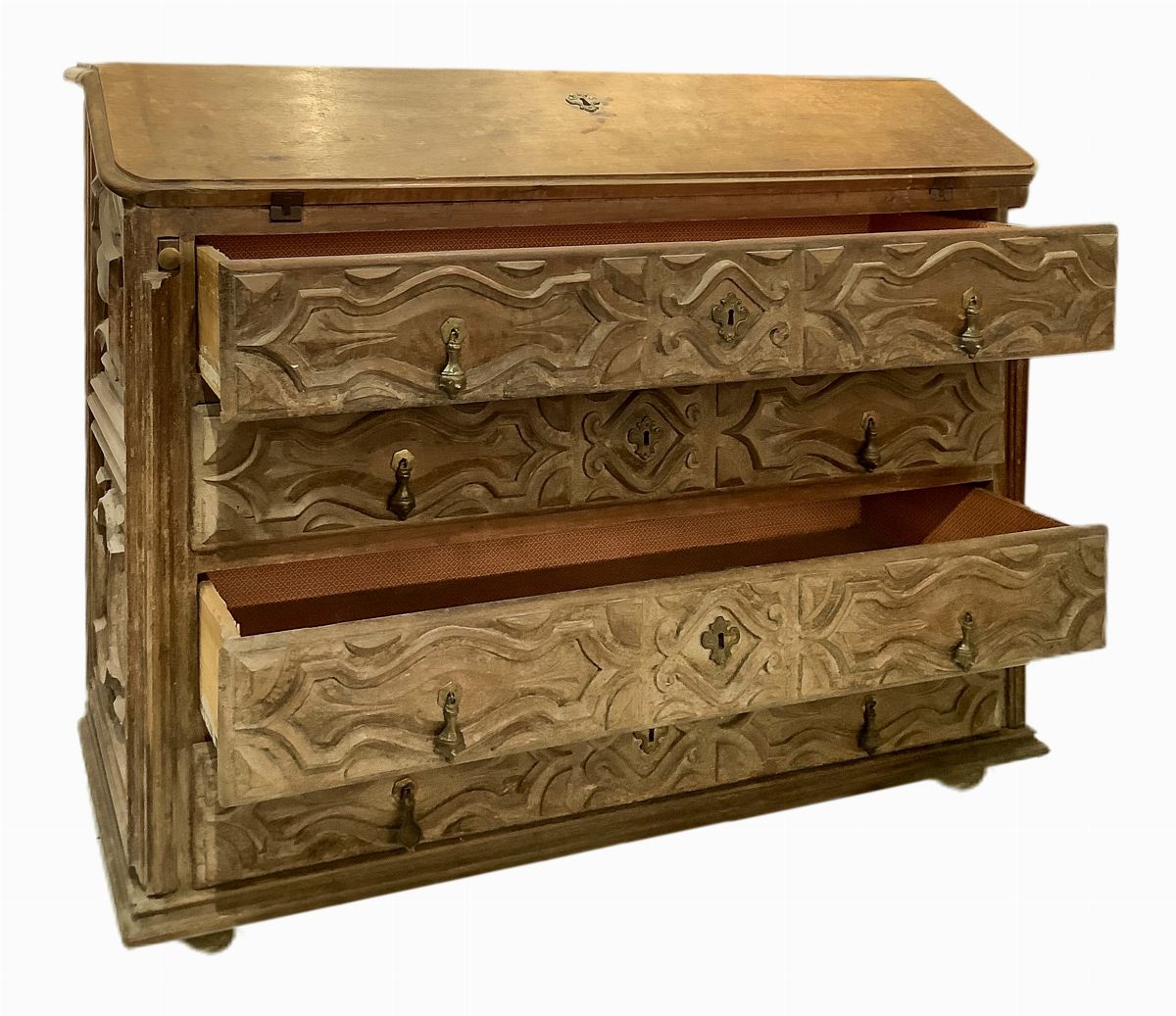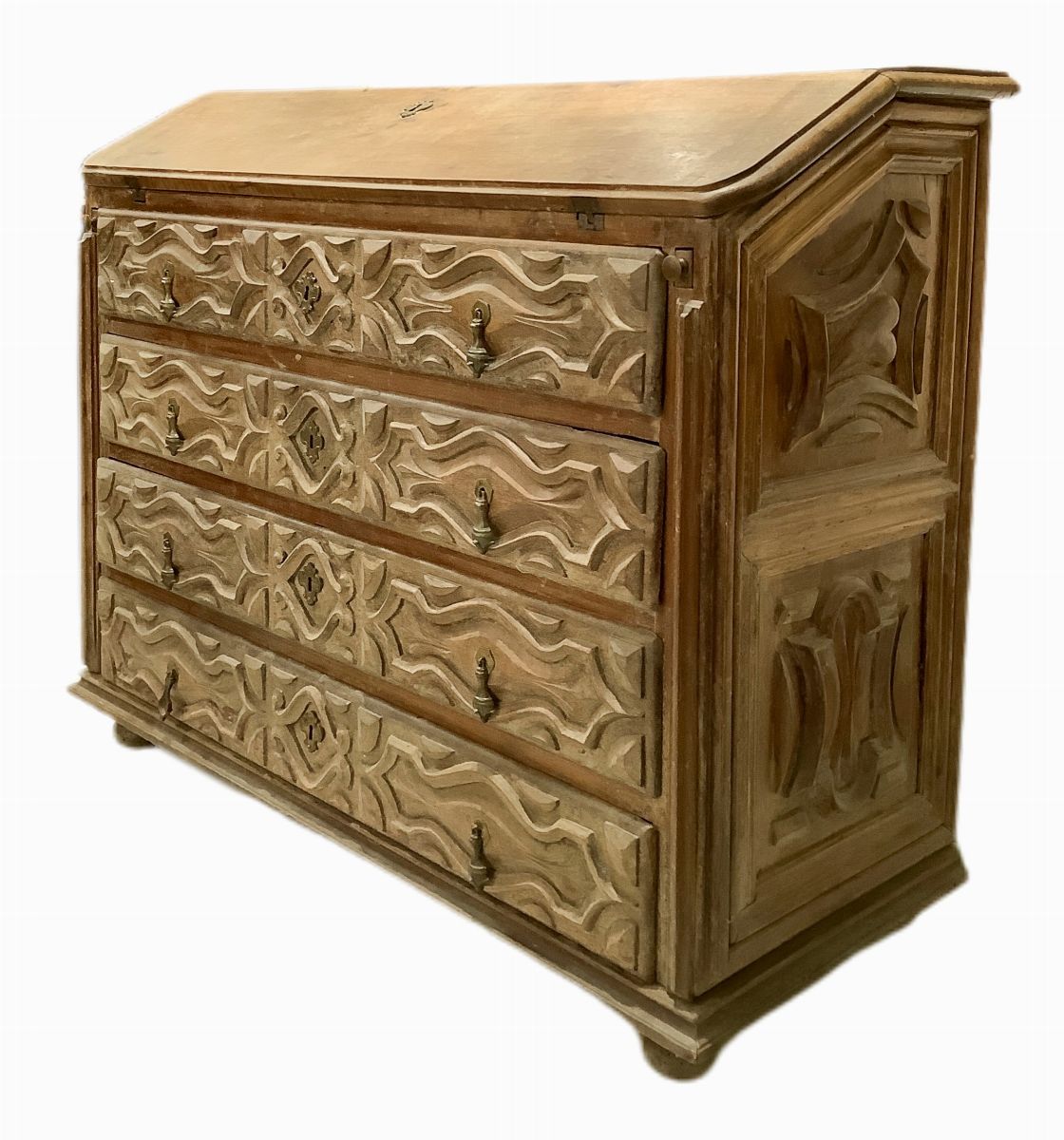 On the front are four carved drawers divided into three oblong sections, each with a pendant pull and a lily-shaped keyhole in the center. The sides are carved into two large sections. Original hardware, flattened round feet.