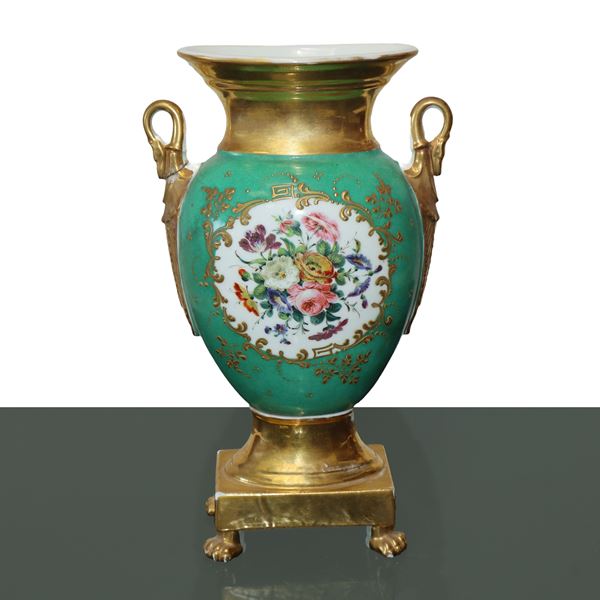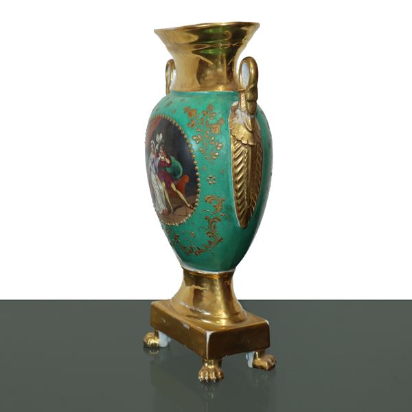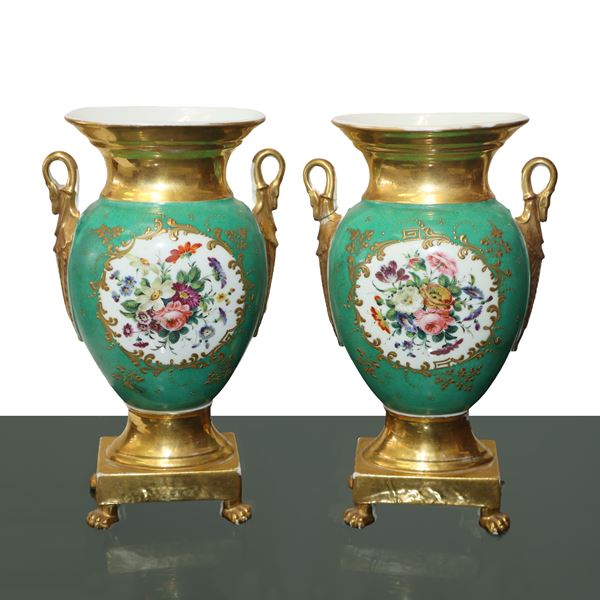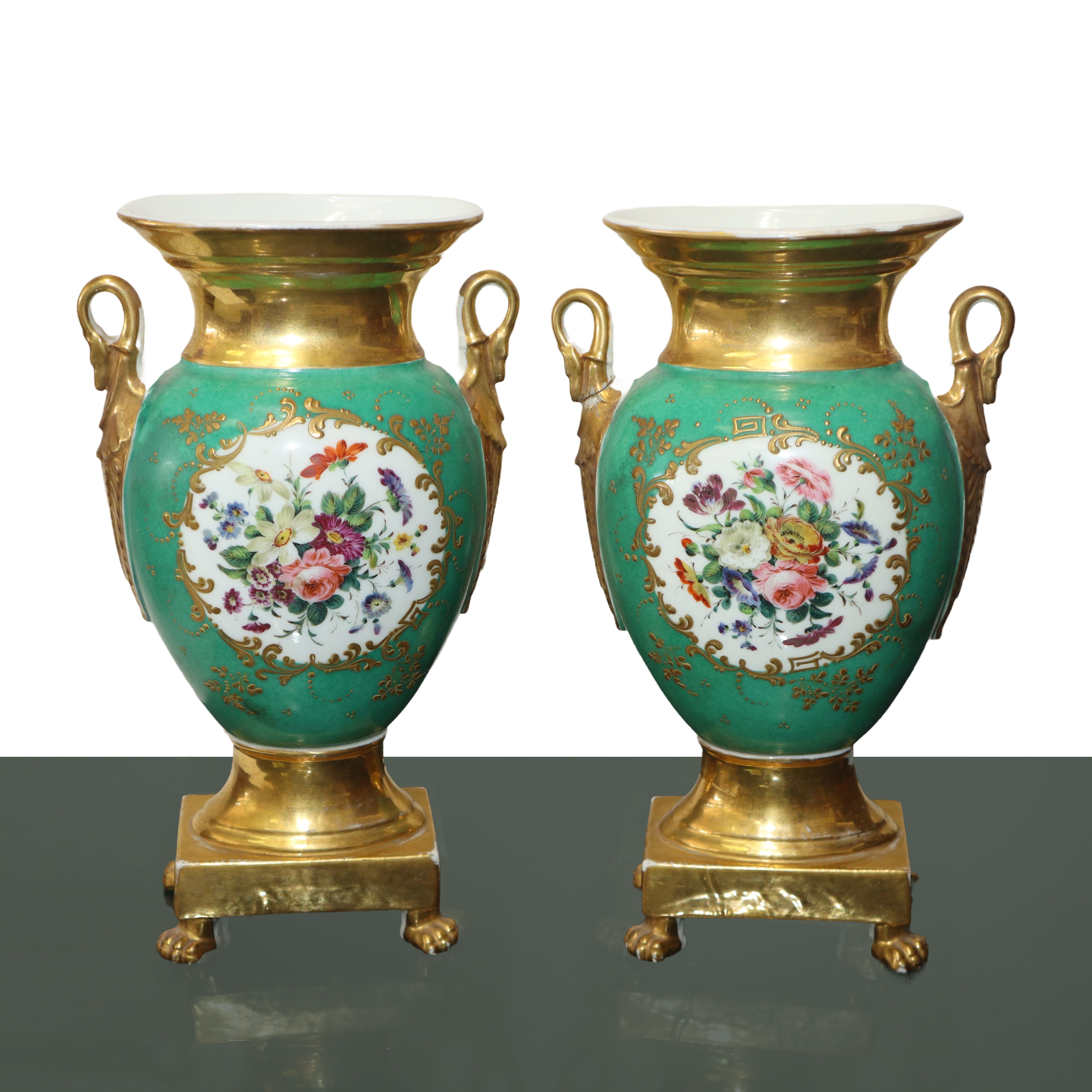 Pair of Old French Empire green and gold vases on a gold base with lion's feet