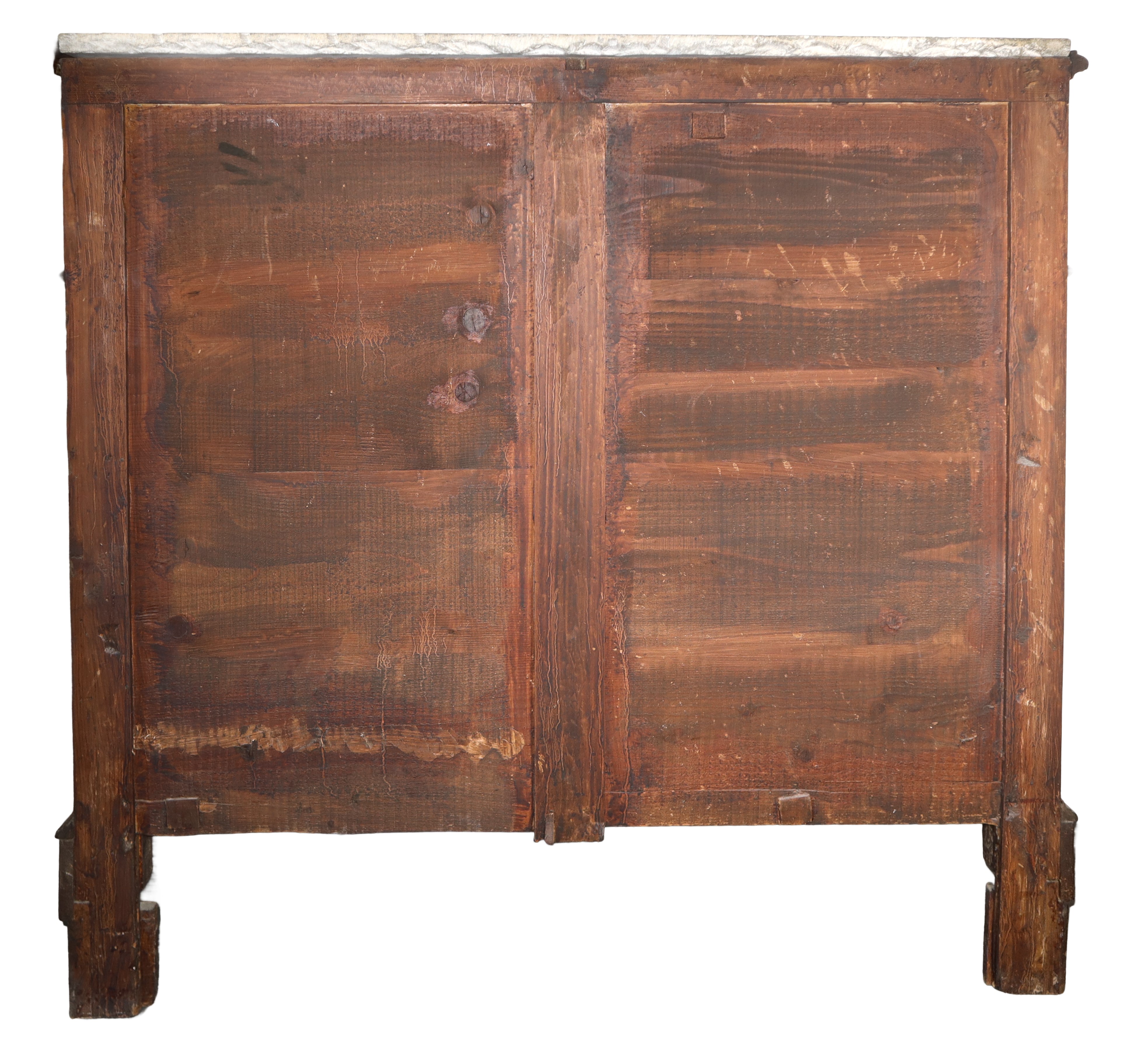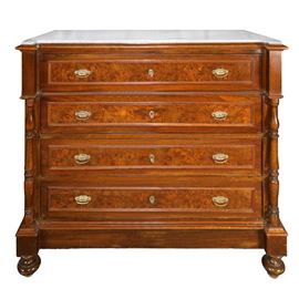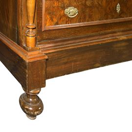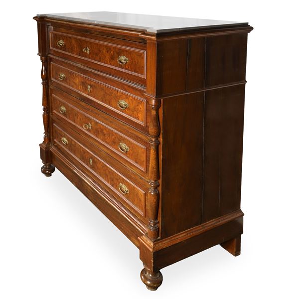 Walnut burl chest of drawers with 4 drawers and columns on the sides