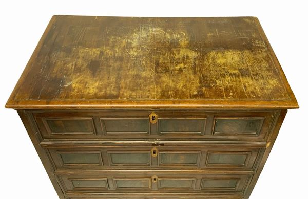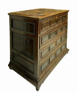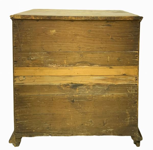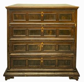 On the front are four drawers, each decorated with rosewood veneered panels. On the sides are grained panels within rectangular frames. Bracket feet.