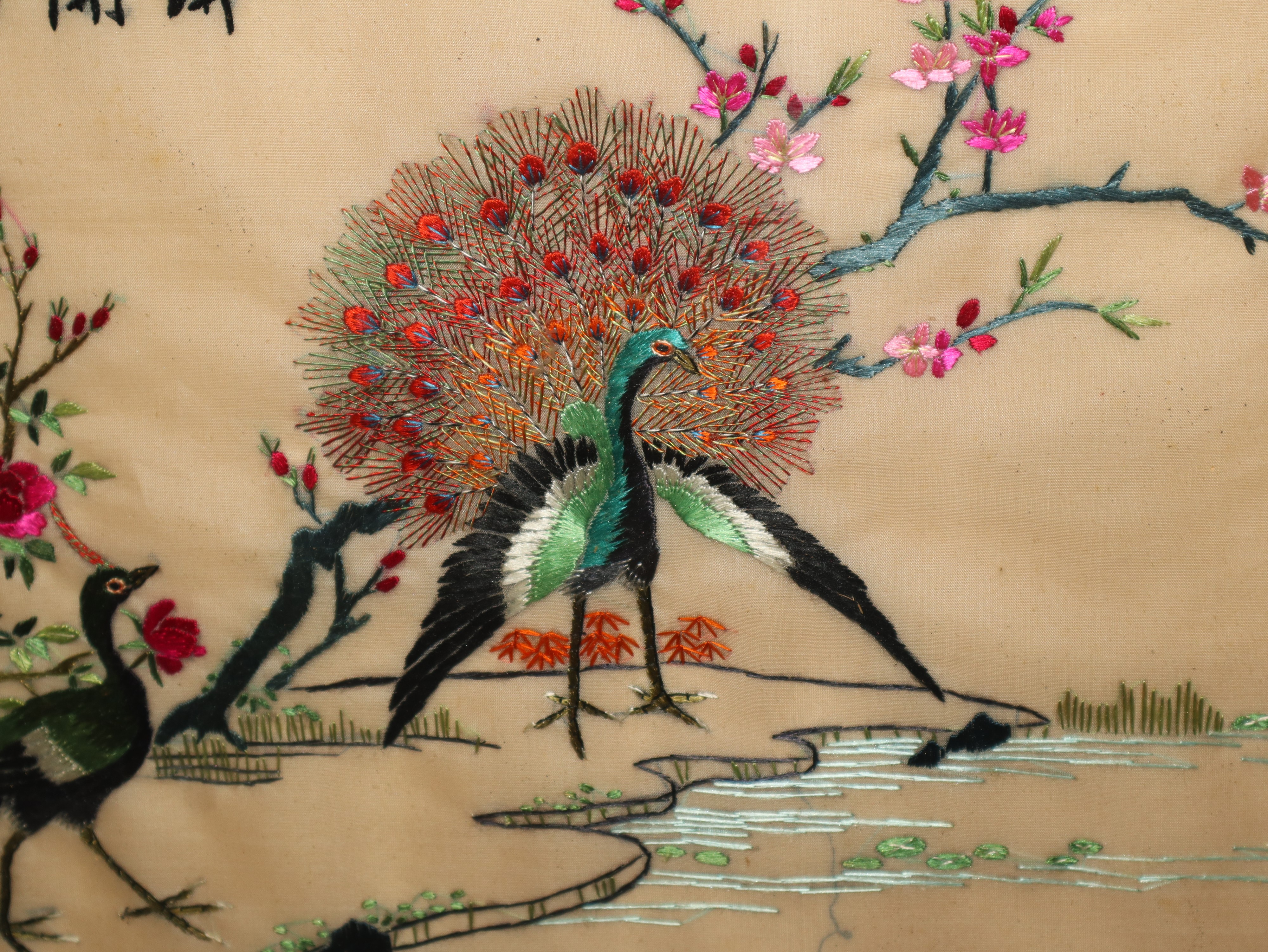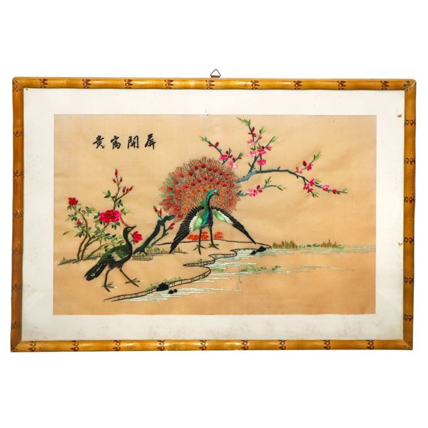 A PAIR OF CHINESE SUZHOU SILK PANELS EMBROIDERED WITH POLYCHROME REPRESENTATIONS OF BIRDS