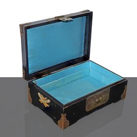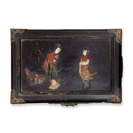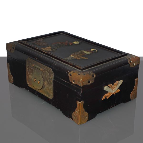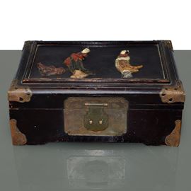 Oriental box with genre scene on the front and decorations on the sides