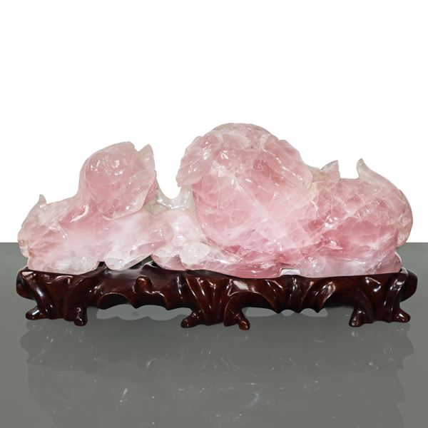 Pink jade sculpture depicting a pair of Pho dogs, mother and child