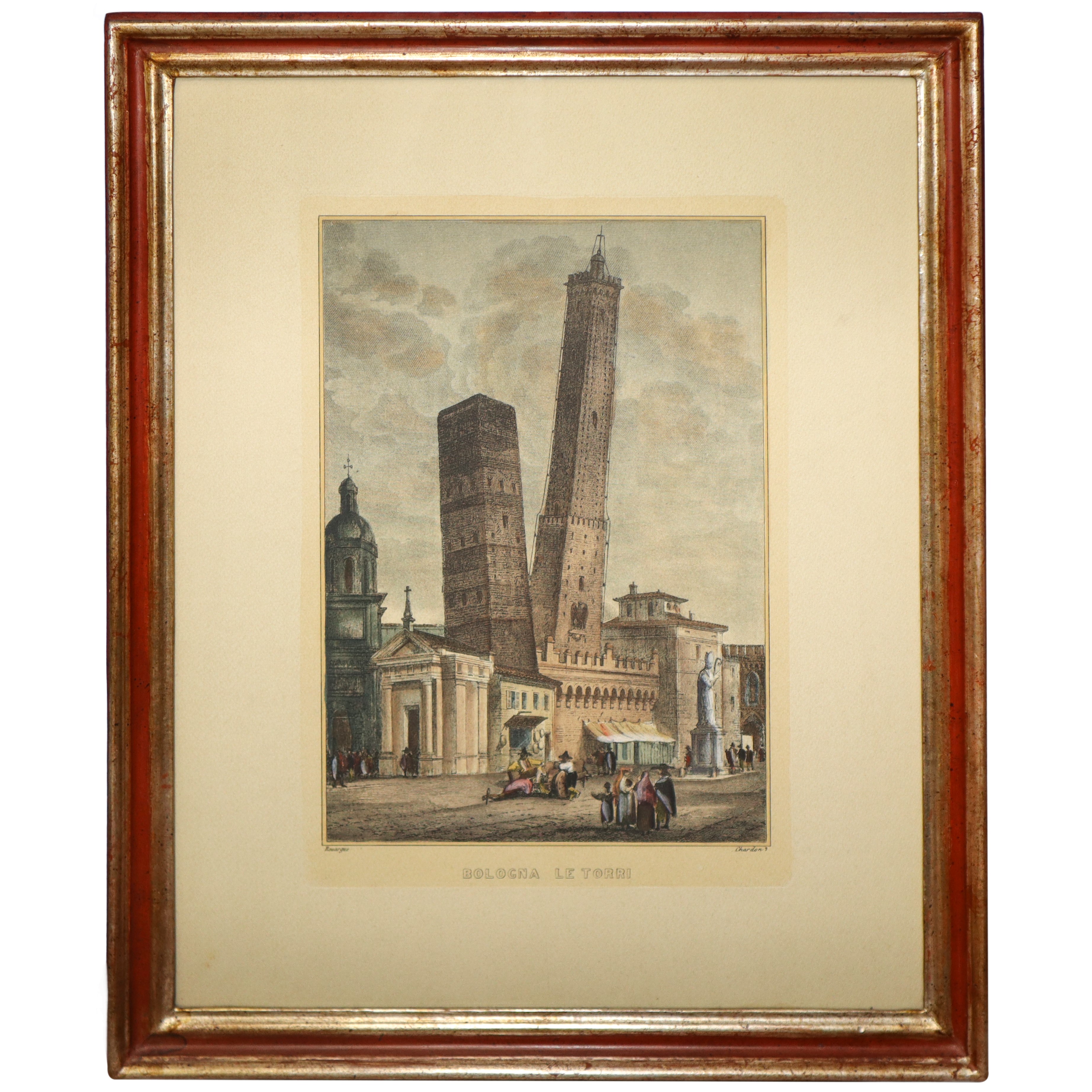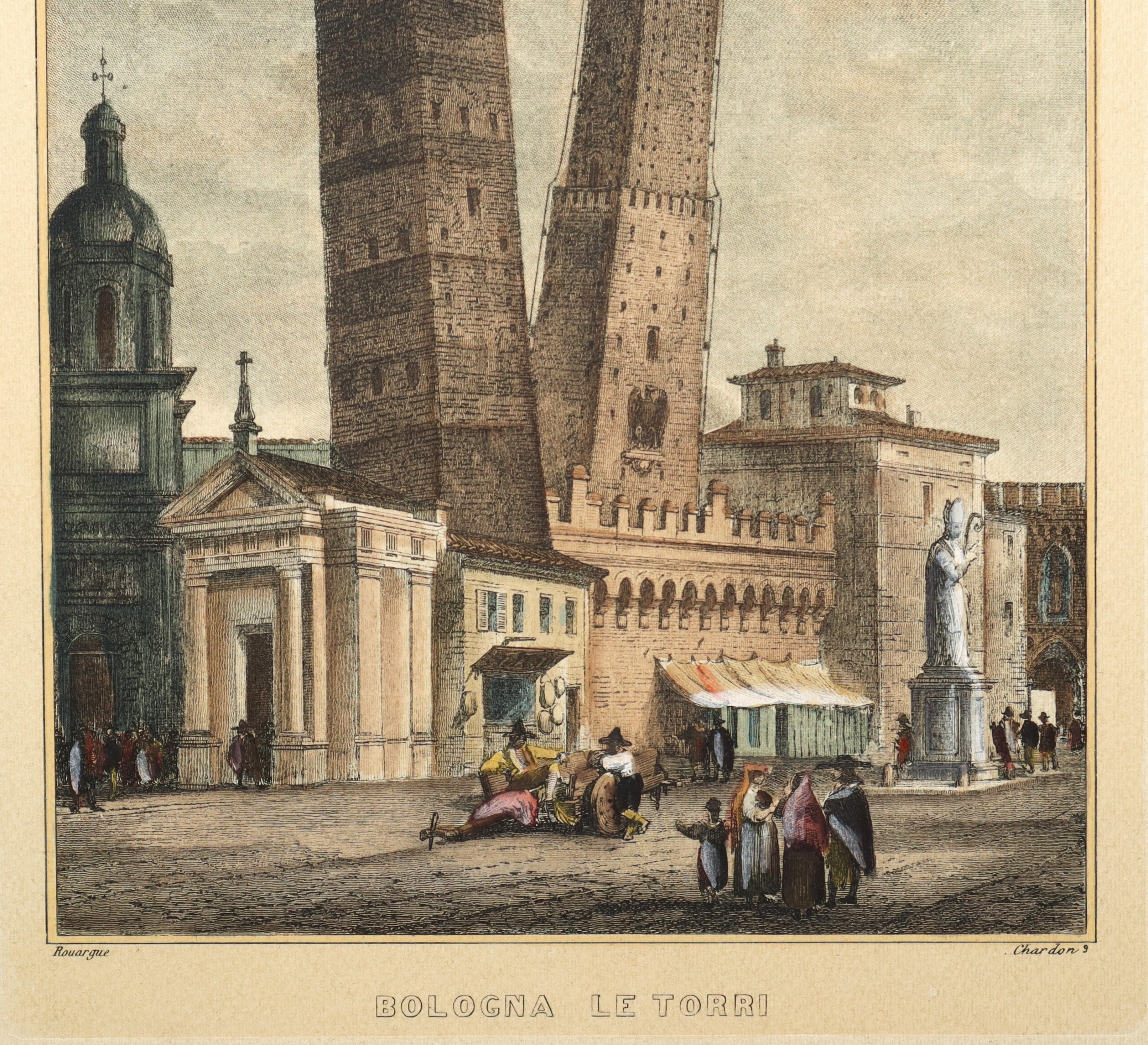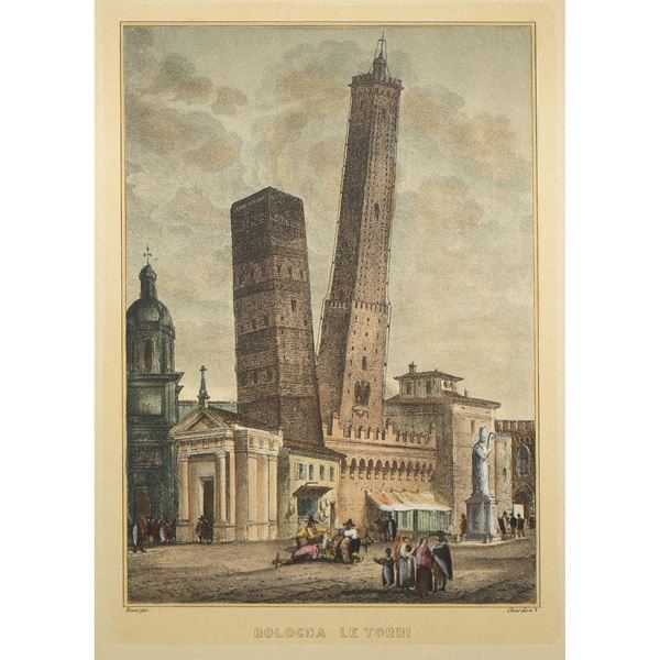 Engraving of the symbolic towers of Bologna, the Asinelli Tower and the Garisenda Tower.