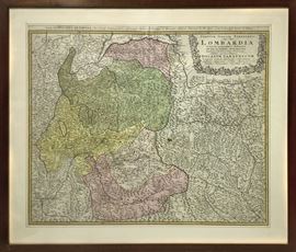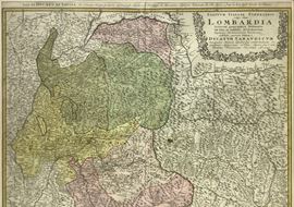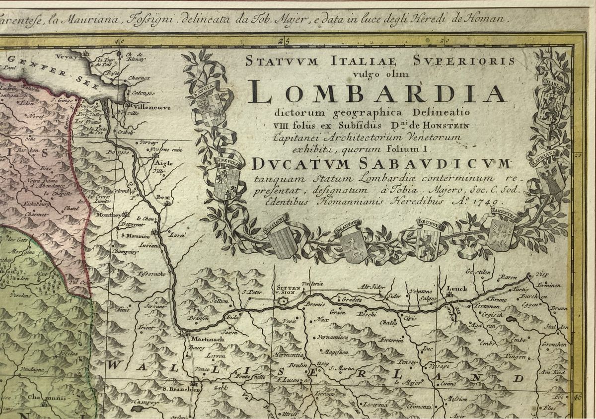 Johnne Baptiste Homann – Lombardy Ducatum Sabaudicum 1721-1750. Watercolor engraving with the surrounding regions in black and white