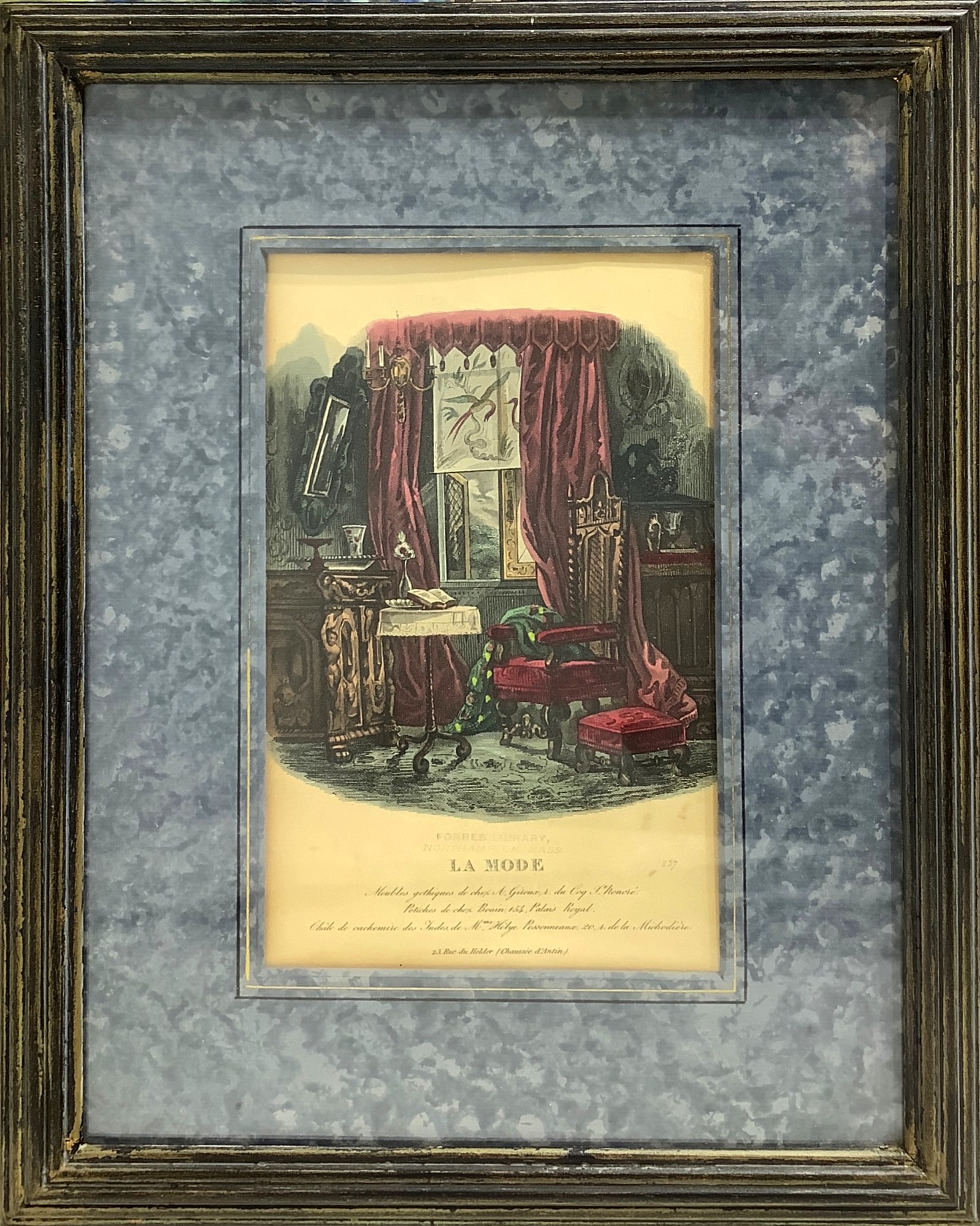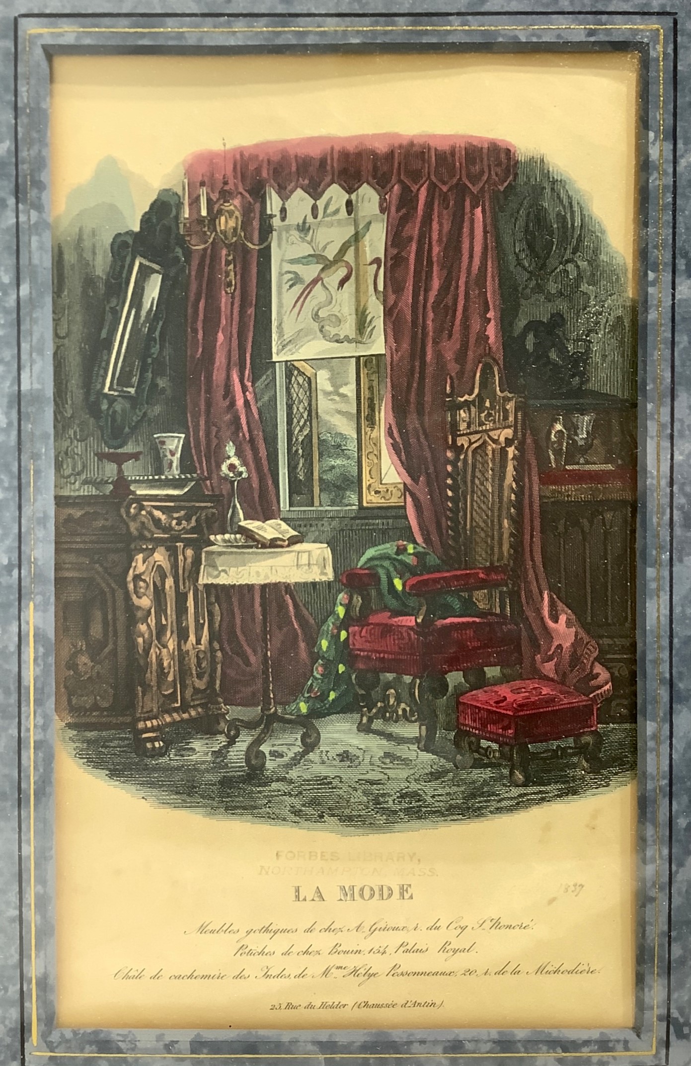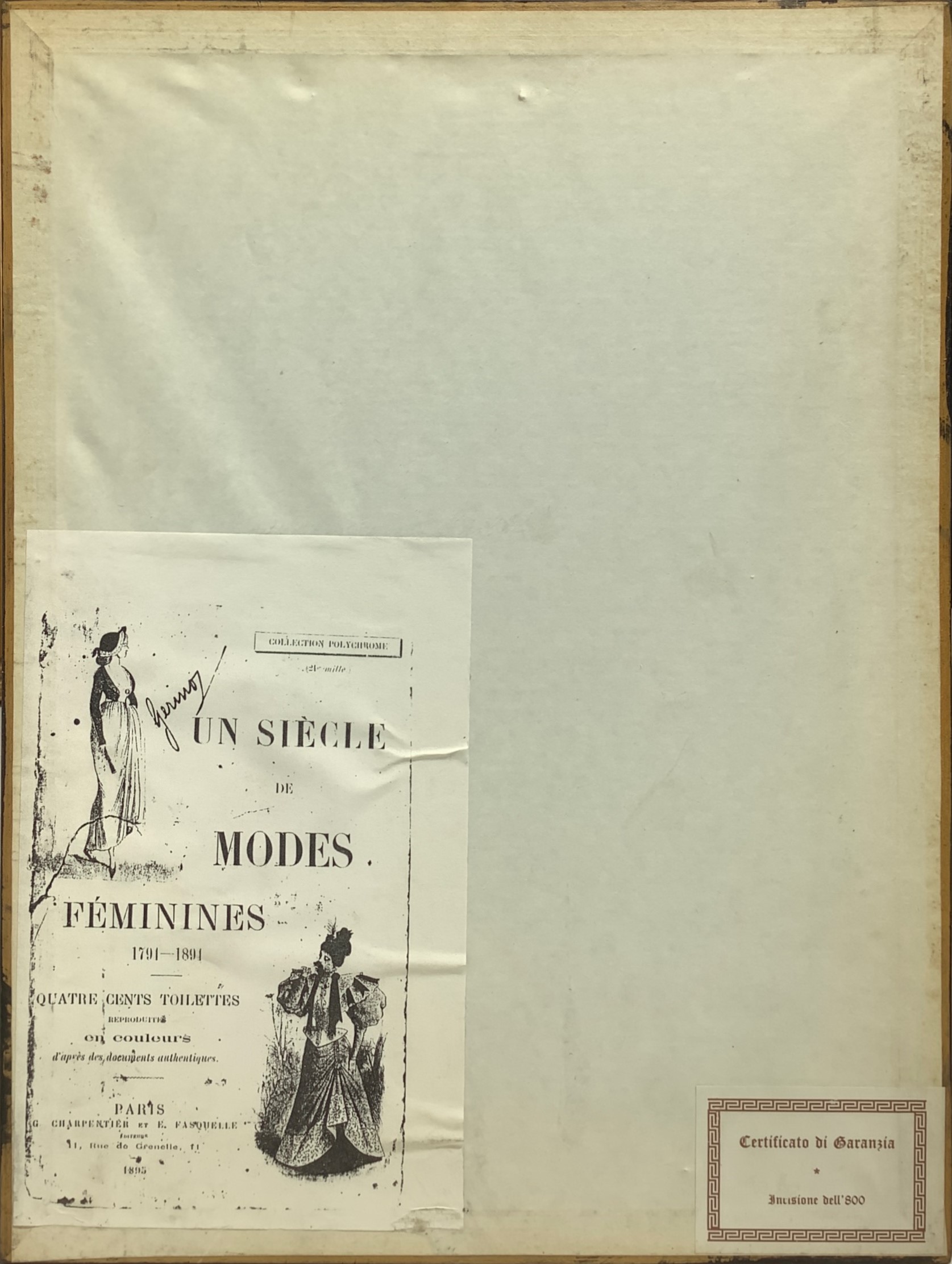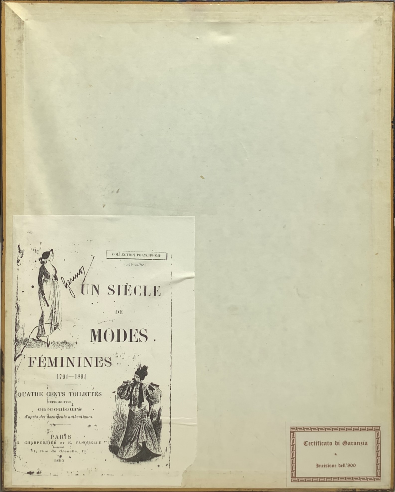 Pair of prints depicting women's fashion clothes and the home of A. Guoux.