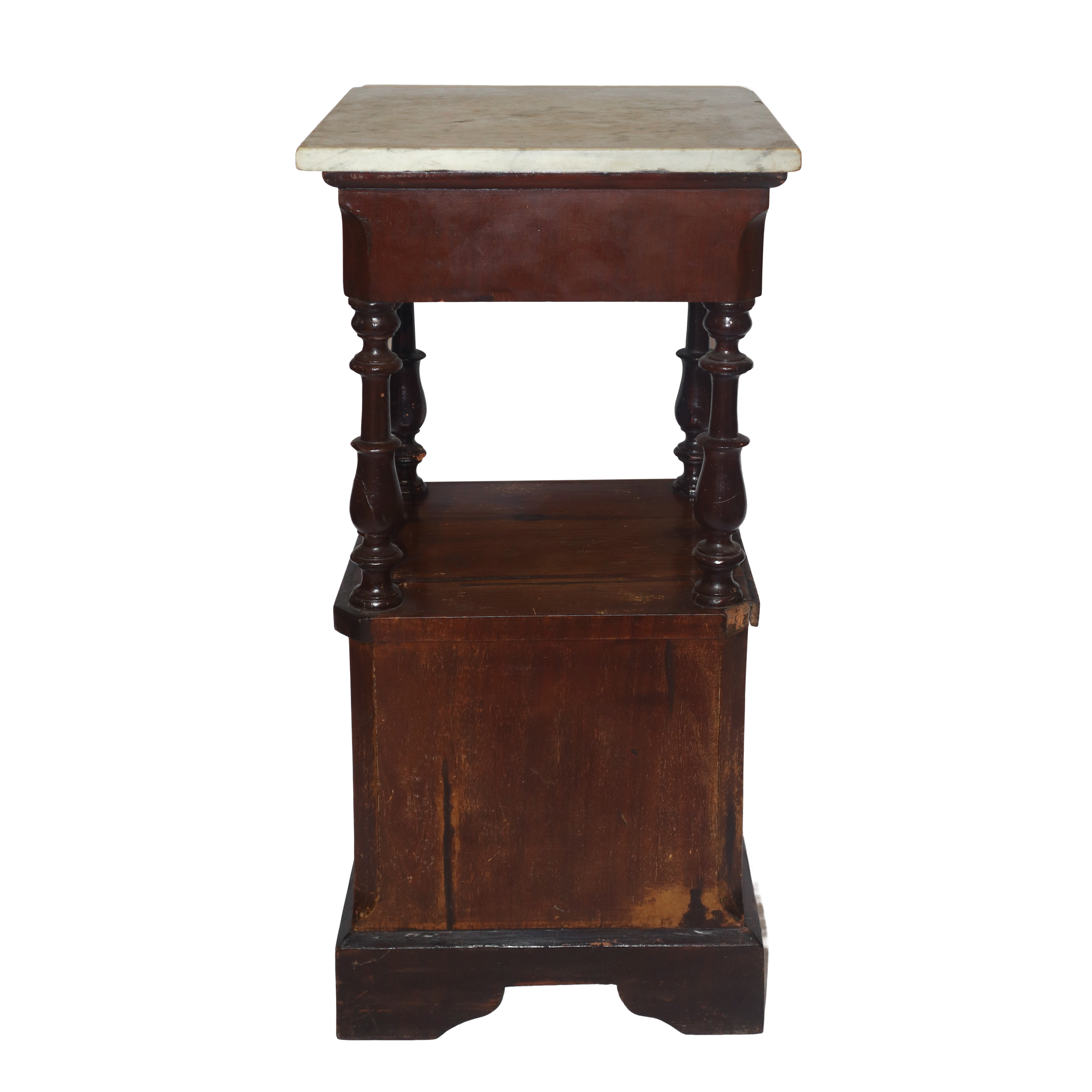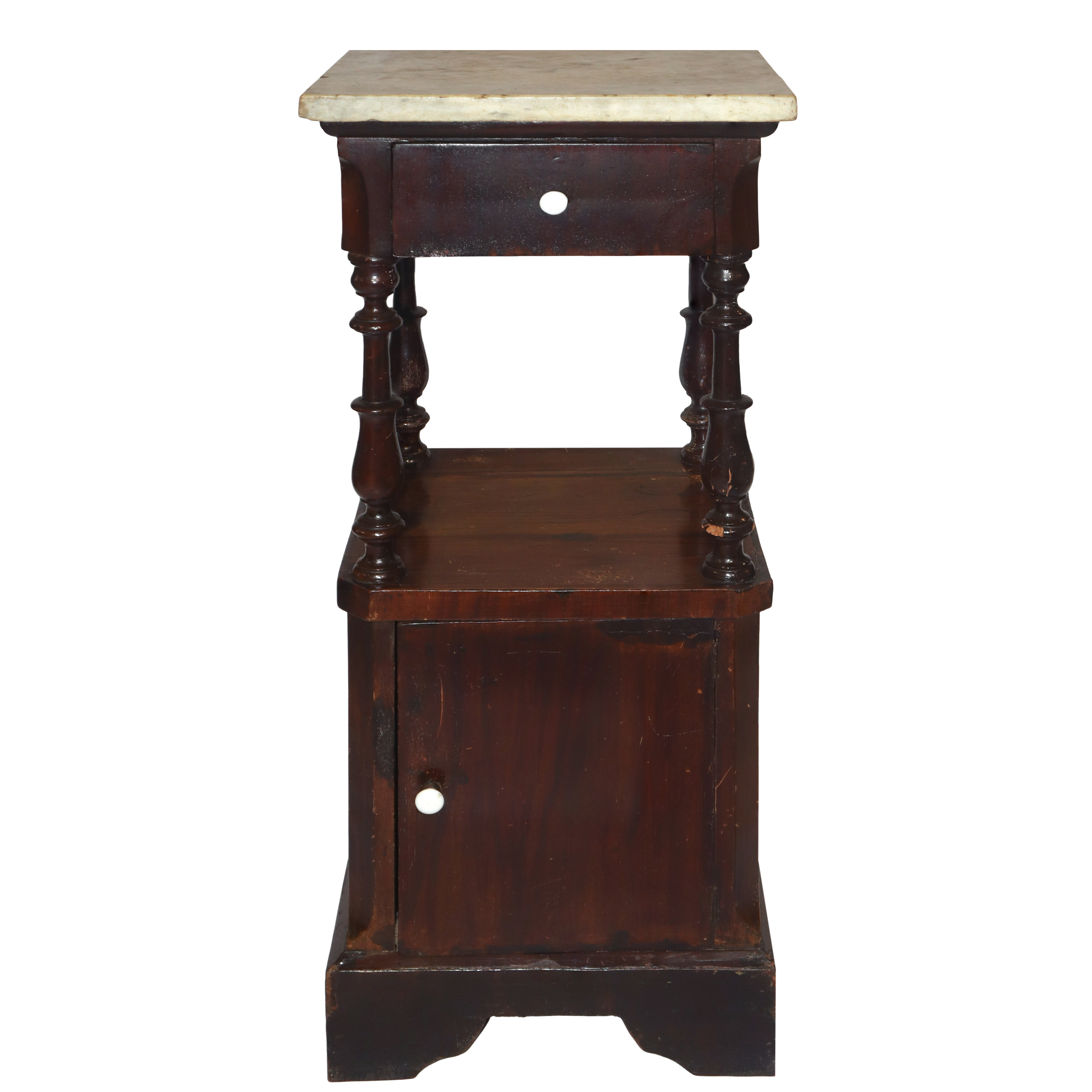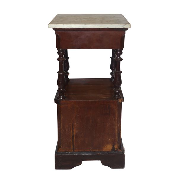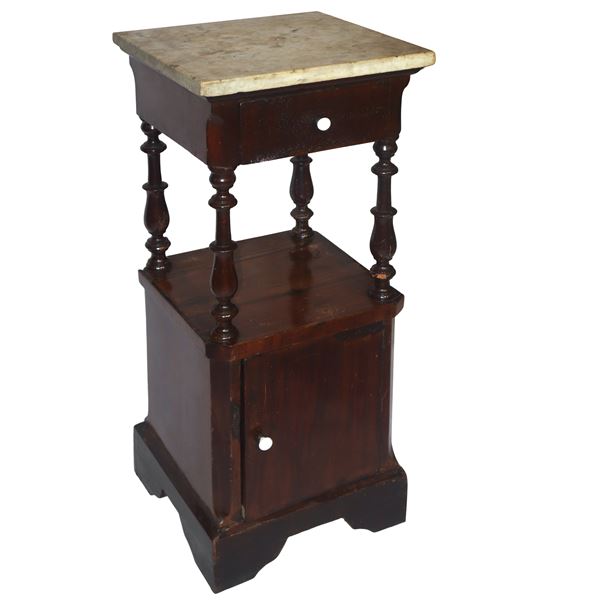 Bedside table with marble top, turned columns under the top and door at the base, 19th century