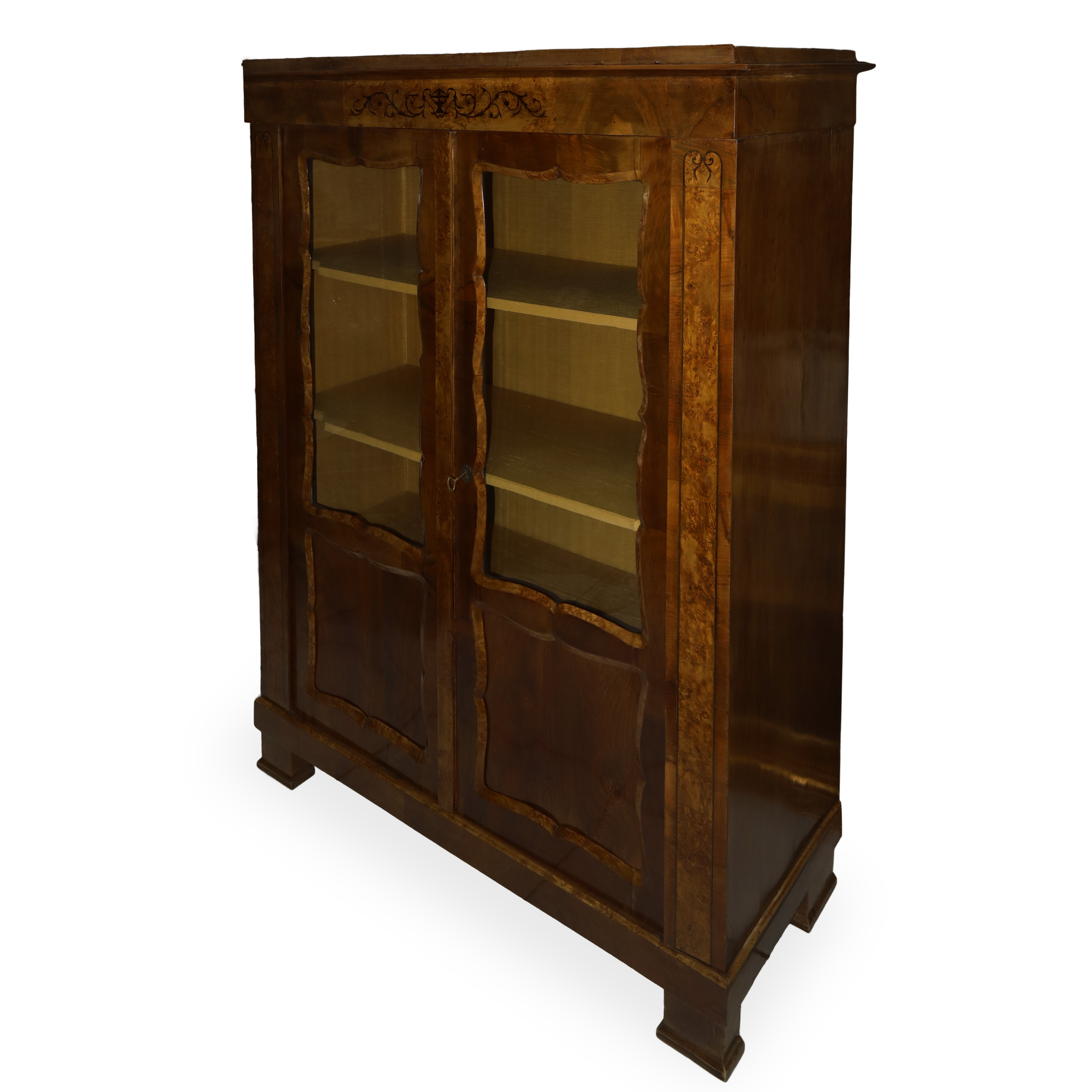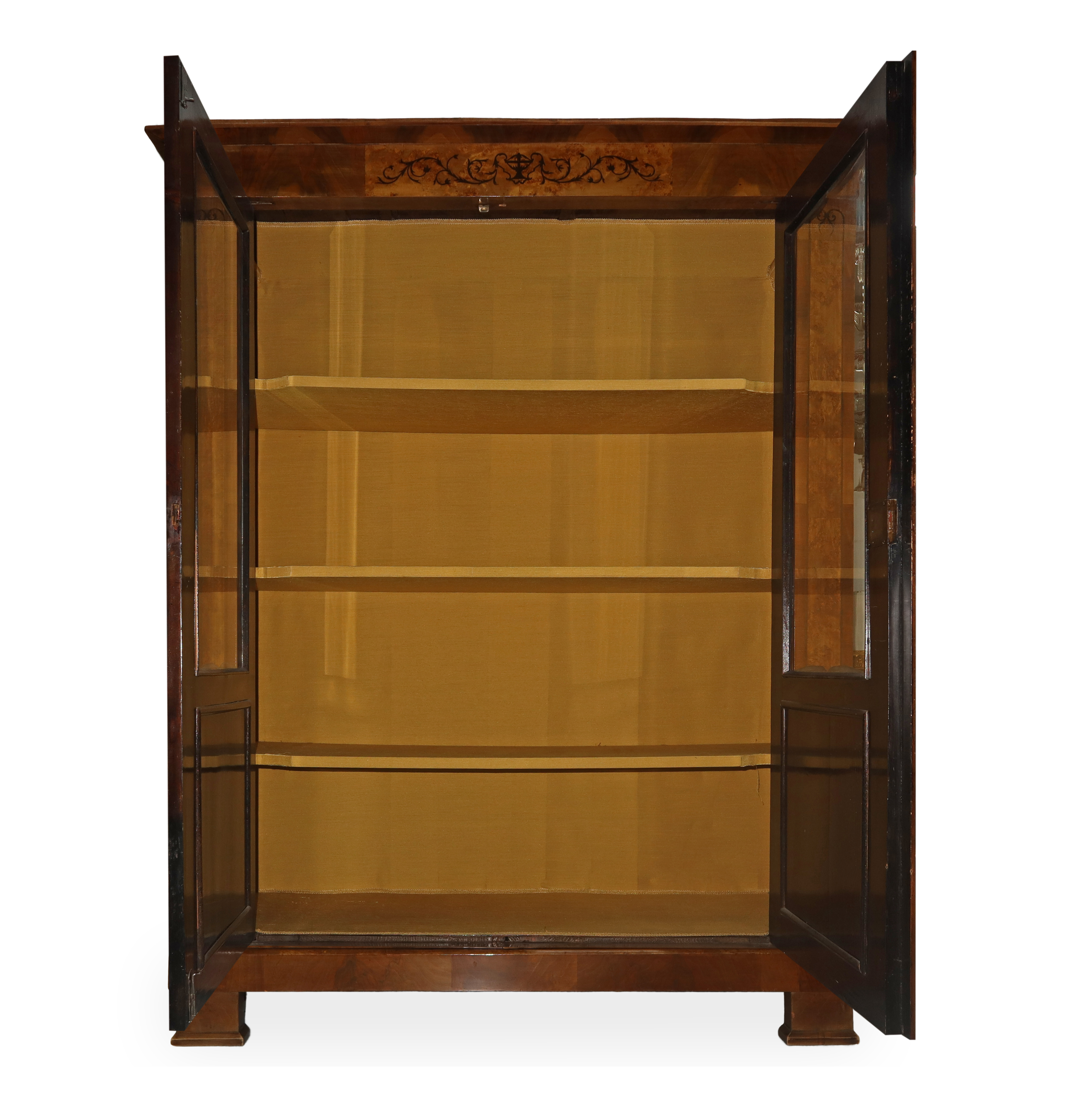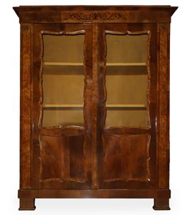 Biedermeier two-door display cabinet in walnut and maple with rosewood inlays, 19th century