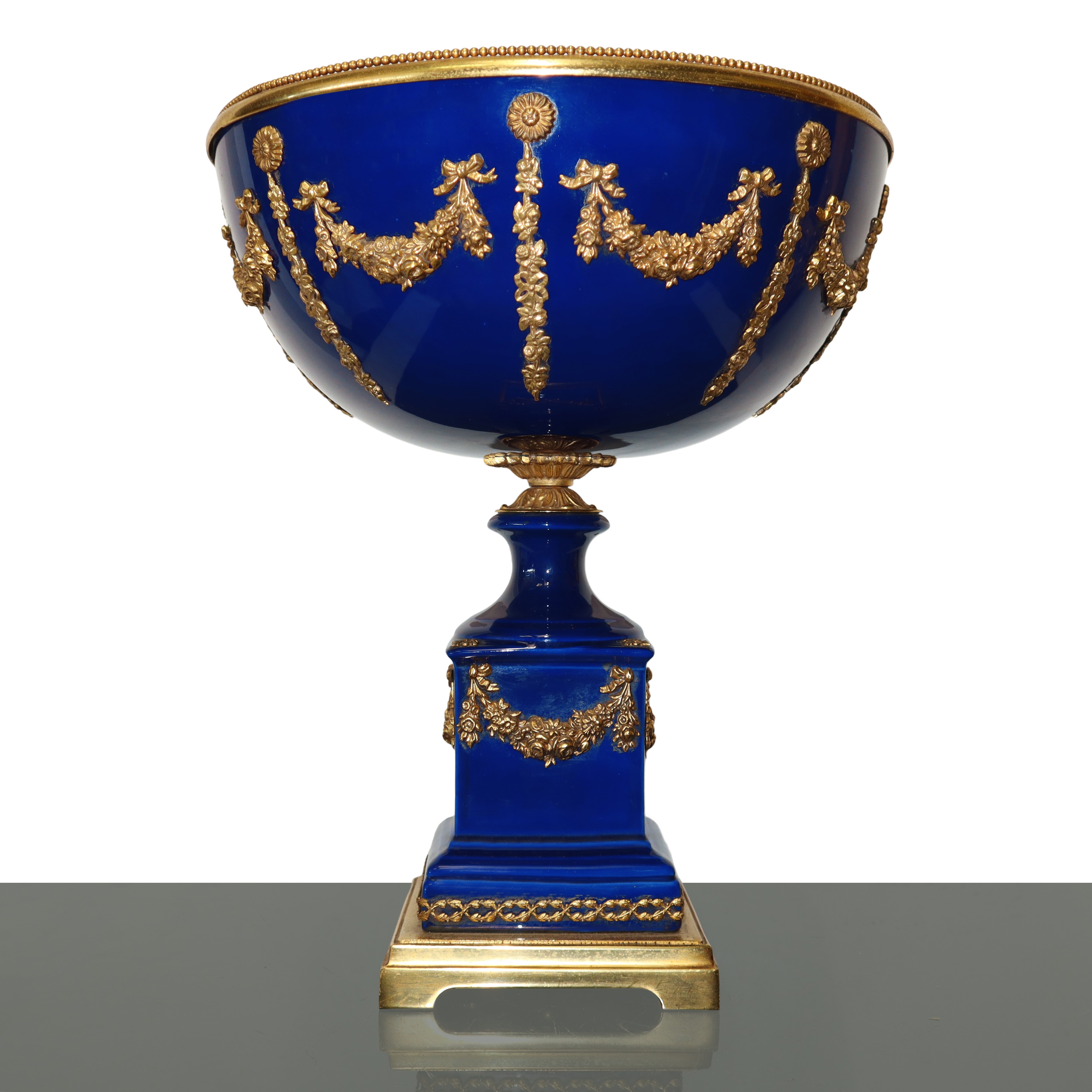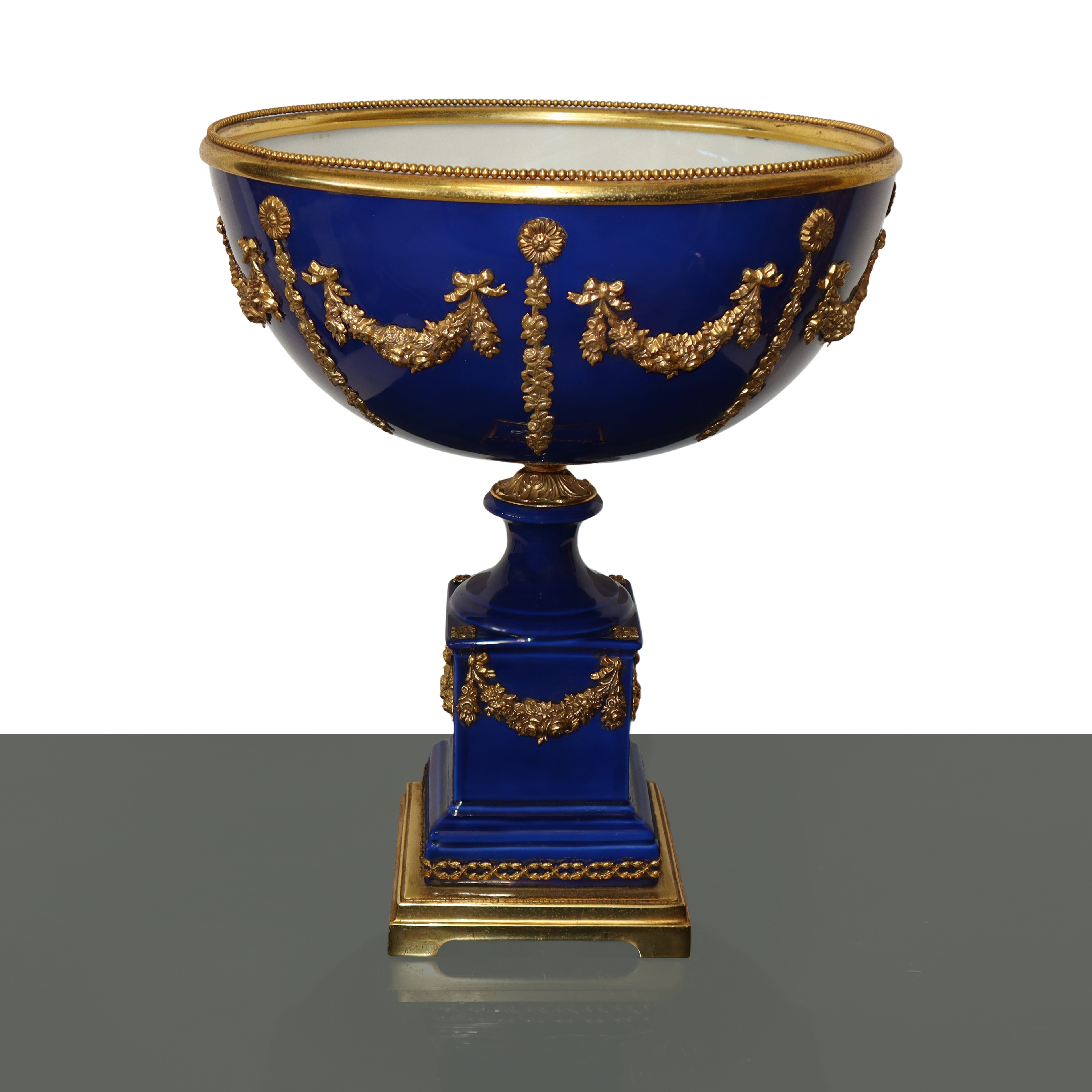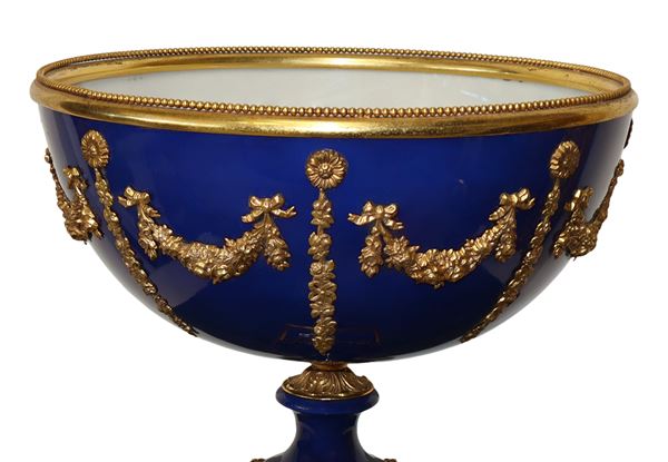 Blue porcelain centerpiece cup with gold metal garland applications, early 20th century