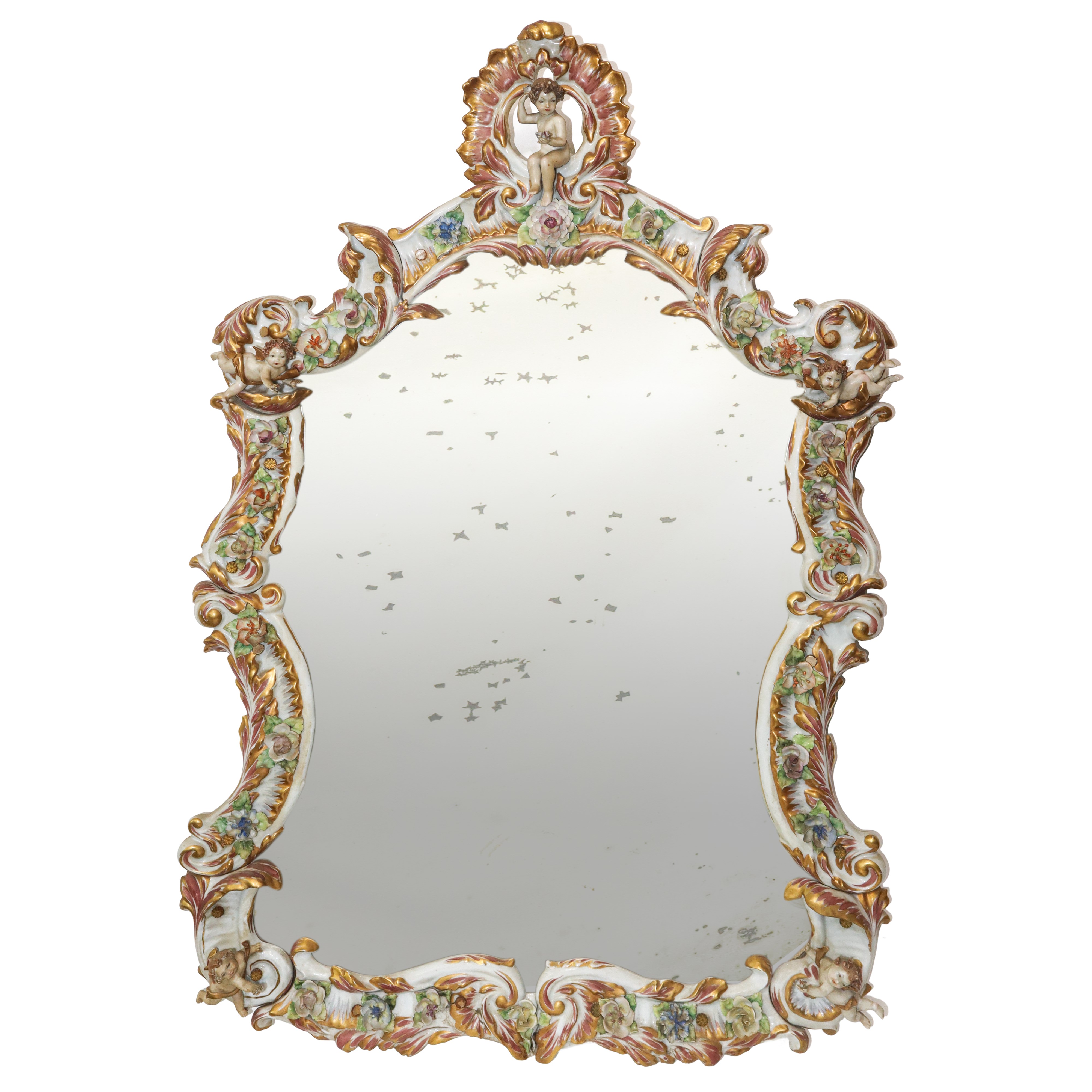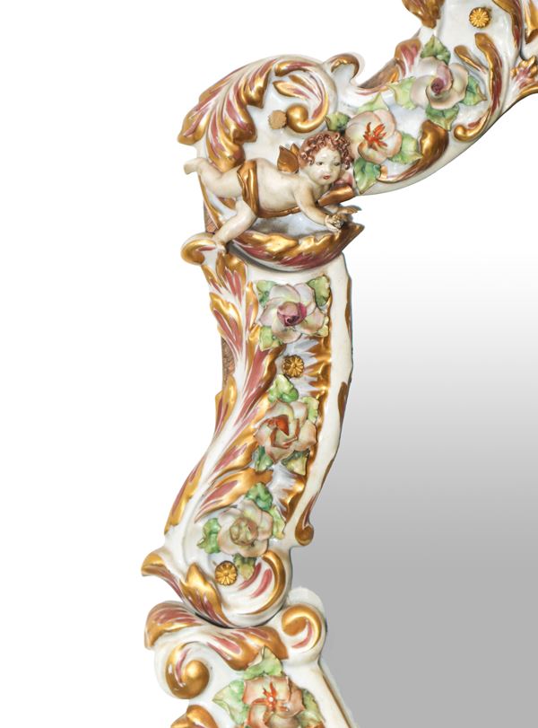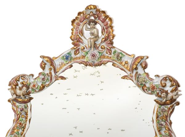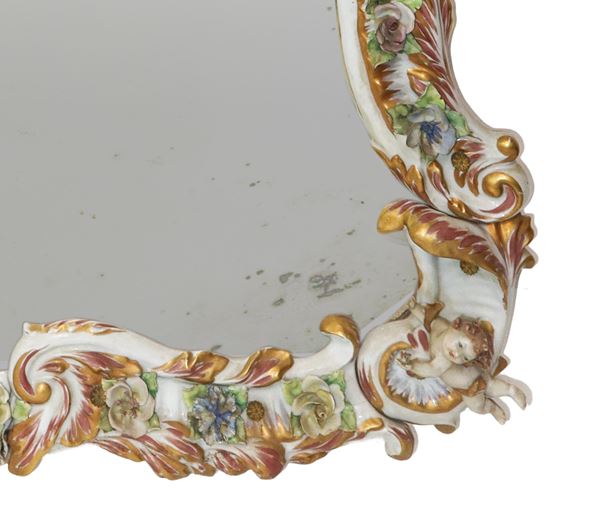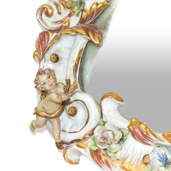 Capodimonte porcelain mirror with cherubs and embossed floral motifs, 19th century