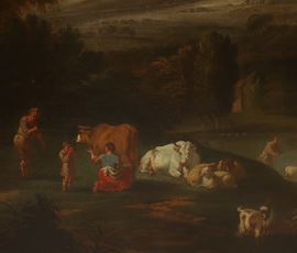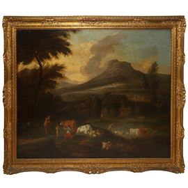 The subject in question, an airy and bucolic Italian landscape with shepherds, fits well within the English landscape tradition, finding, in the composition of the scene and in the rendering of the figures, numerous analogies with the production of certain autograph works by the English painter.