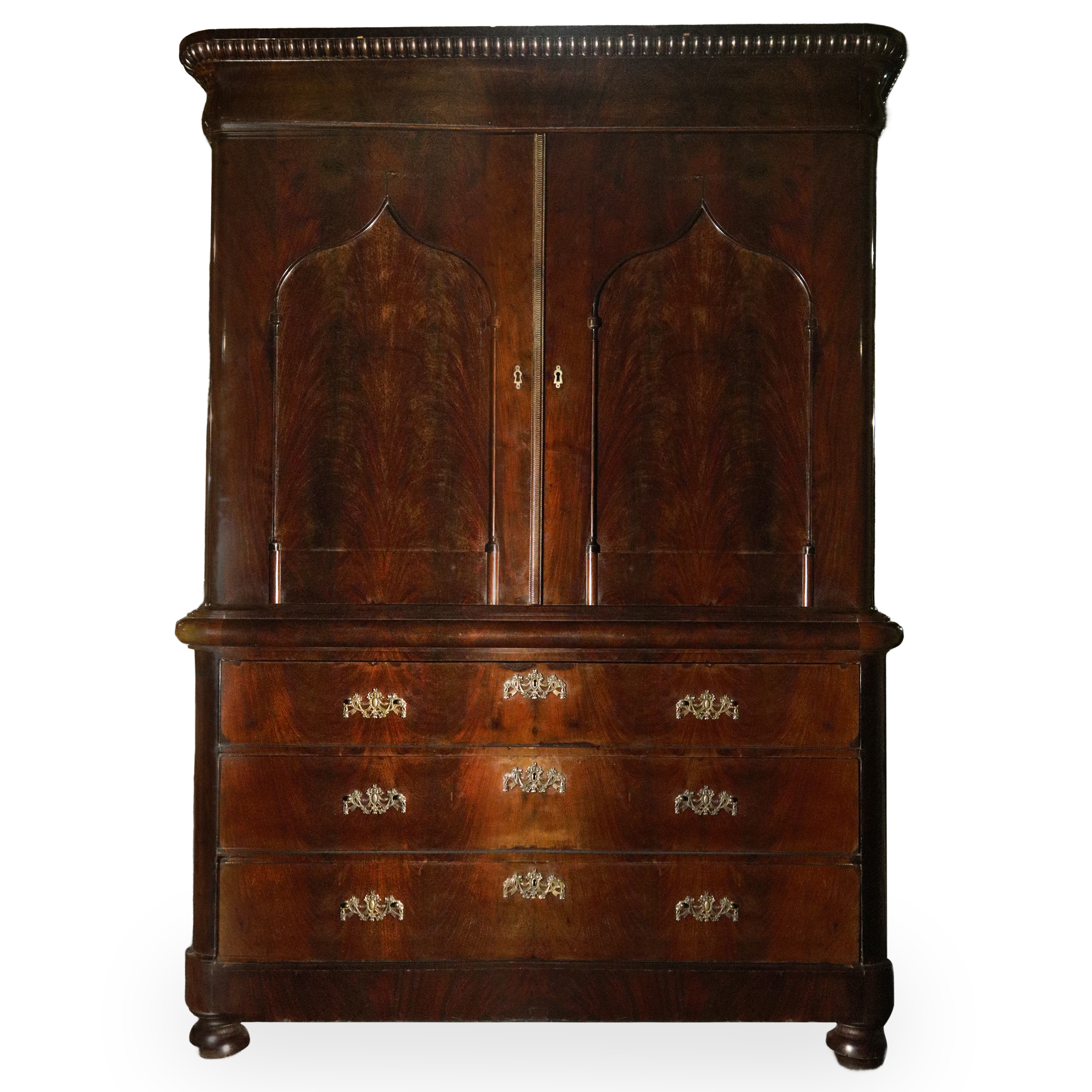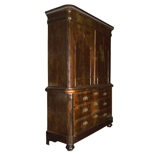Double-body wardrobe with chest of drawers, of neo-Gothic inspiration, 19th Century