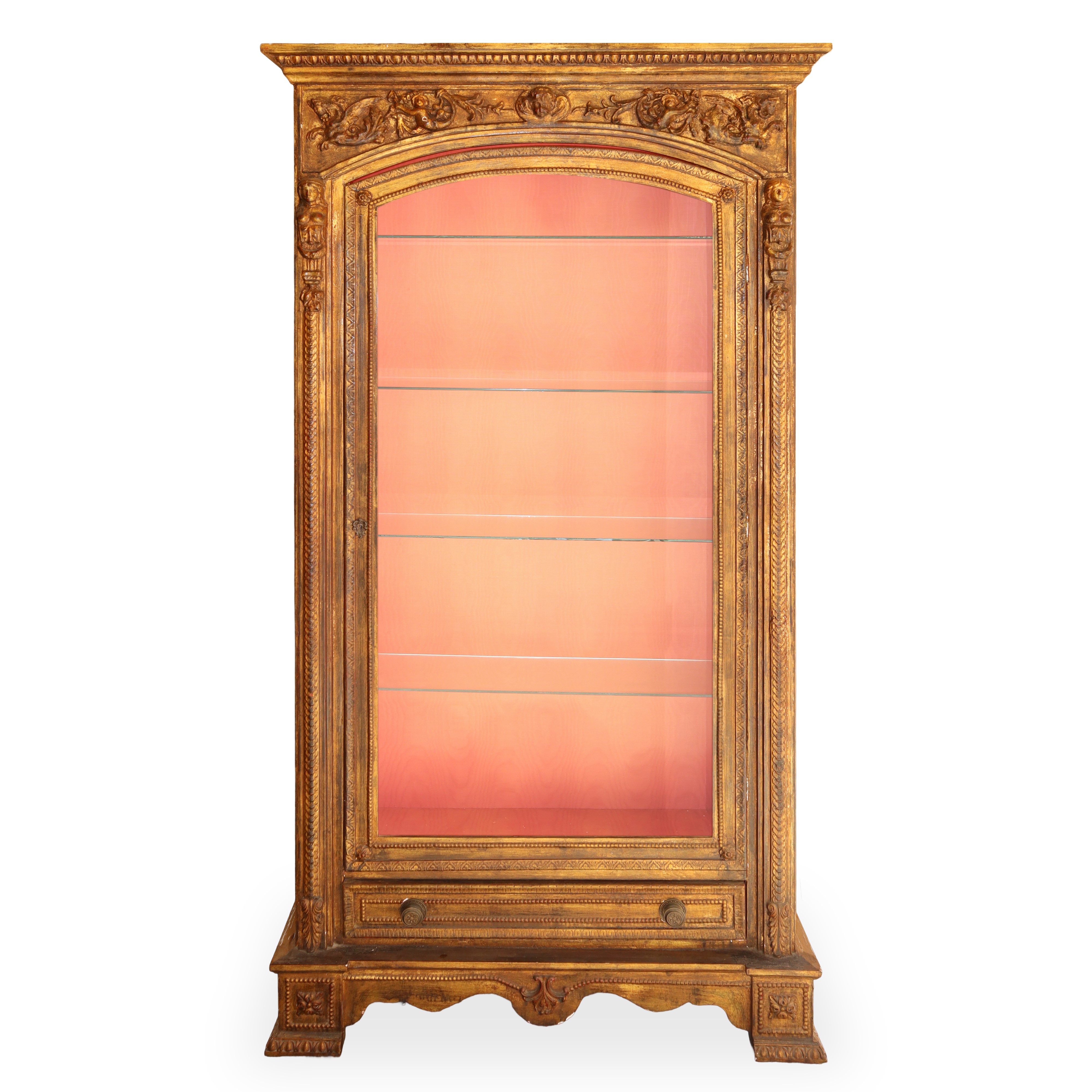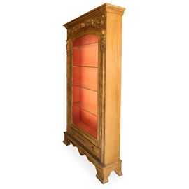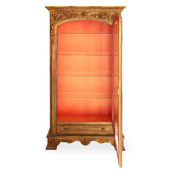 Gilded wooden display cabinet with one glass door featuring neoclassical figures, festoons and grotesques in relief., early 20th century