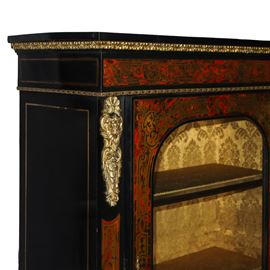 Low sideboard with boulle glass display case, veneered and inlaid with brass, bronzes on the sides and black ebonized wood, late 19th century