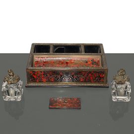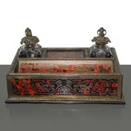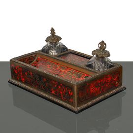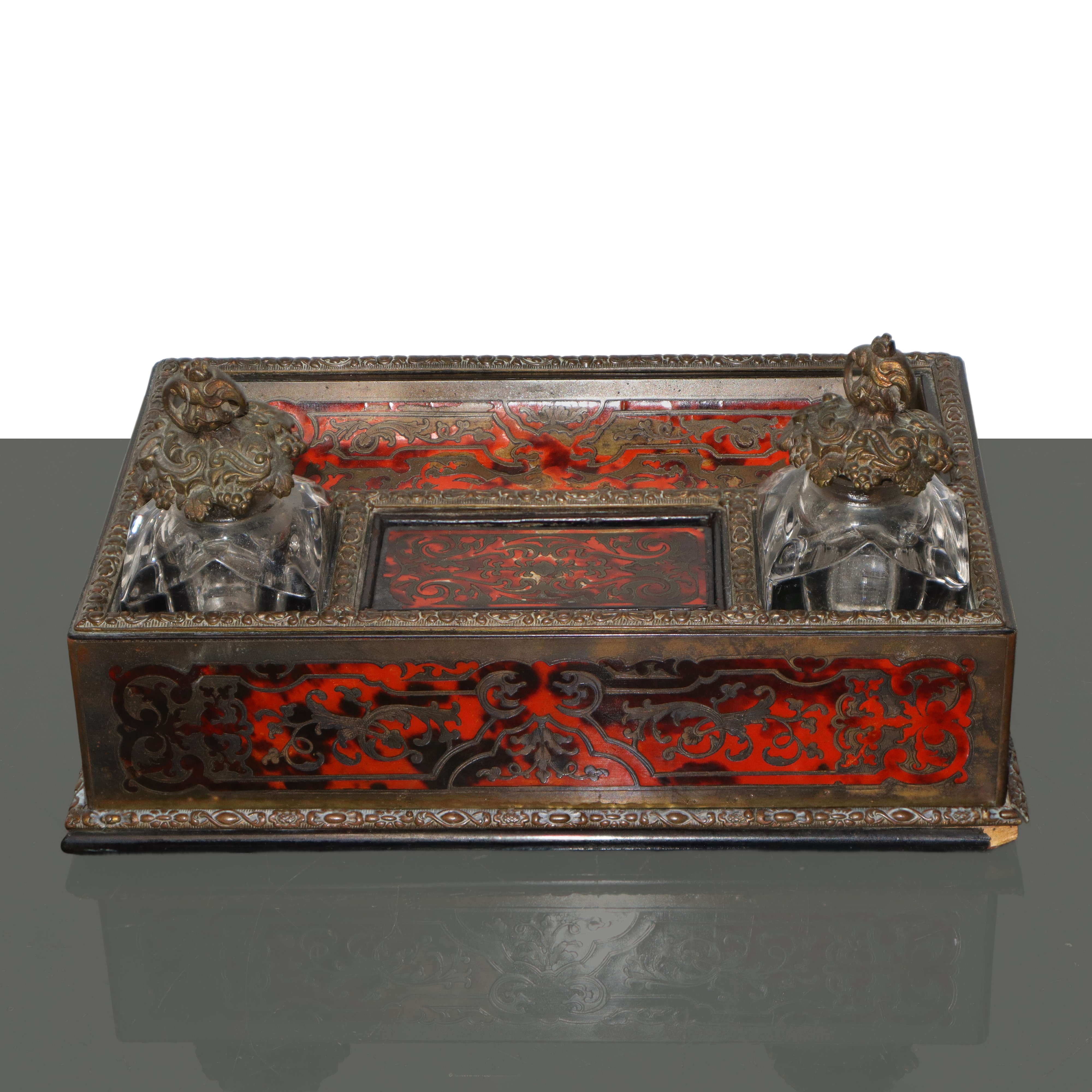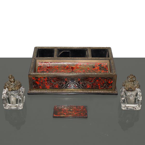 Napoleon III inkwell veneered in brass, frames and caps in gilded bronze, France 1850