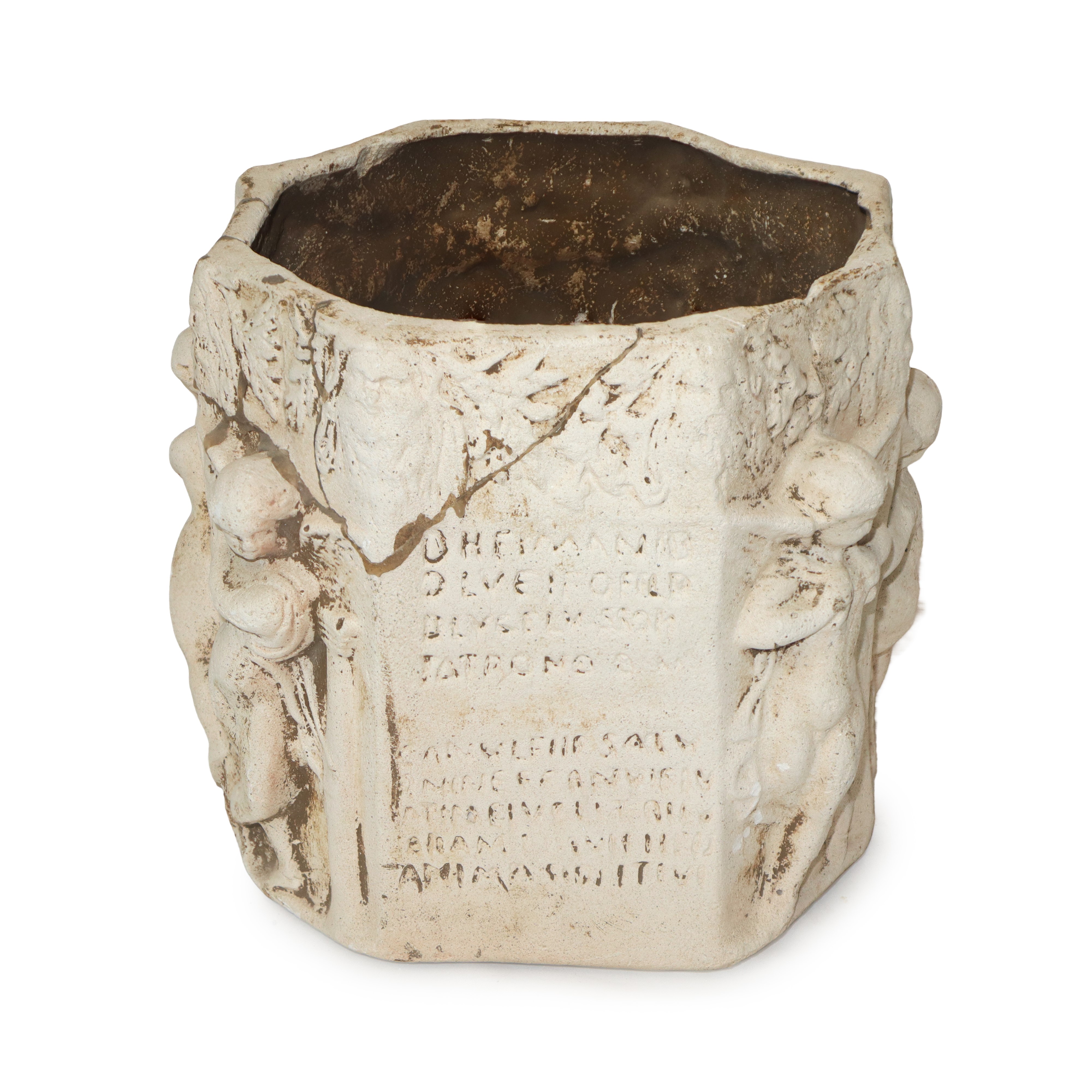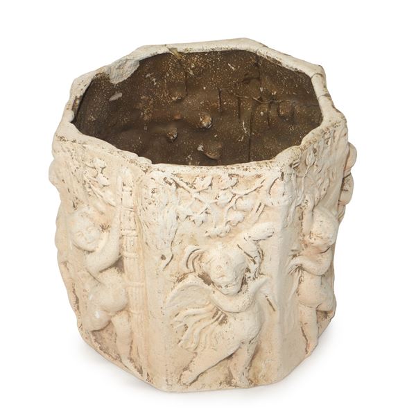 Octagonal plaster vase decorated with cherubs in relief along the entire body of the vase and an inscription on one of the sides