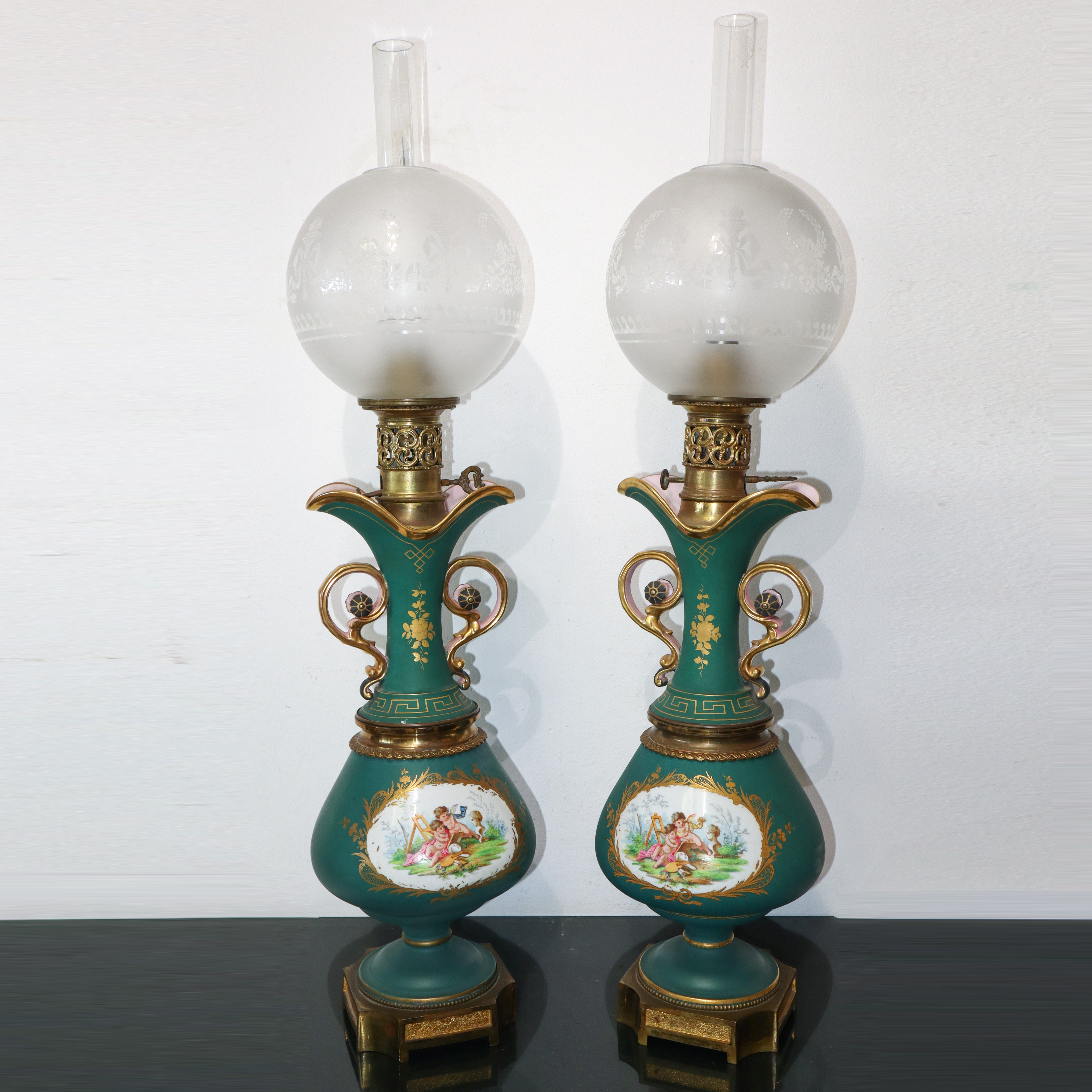 Pair of green porcelain lights with floral design in the center and glass ball bowl