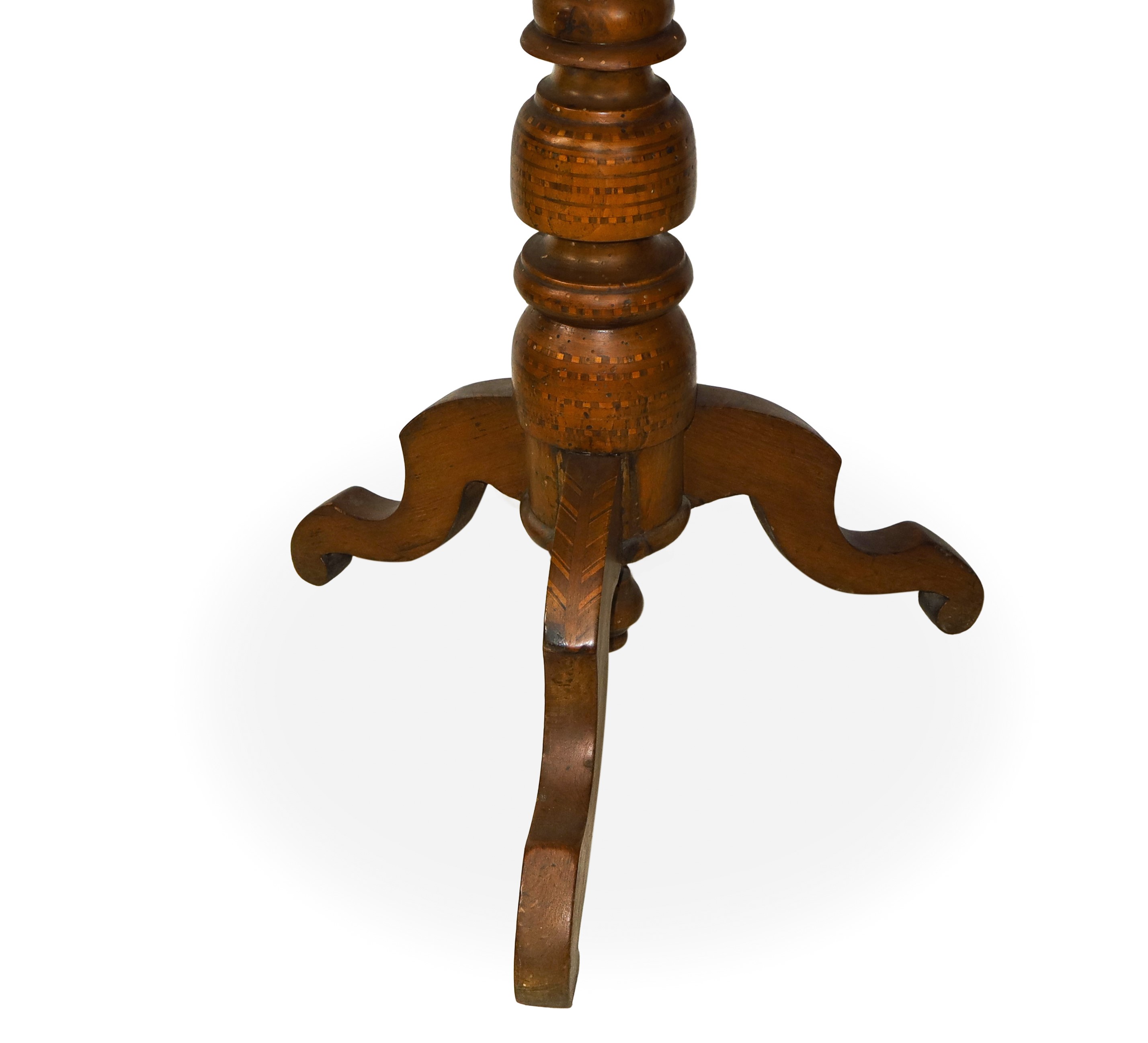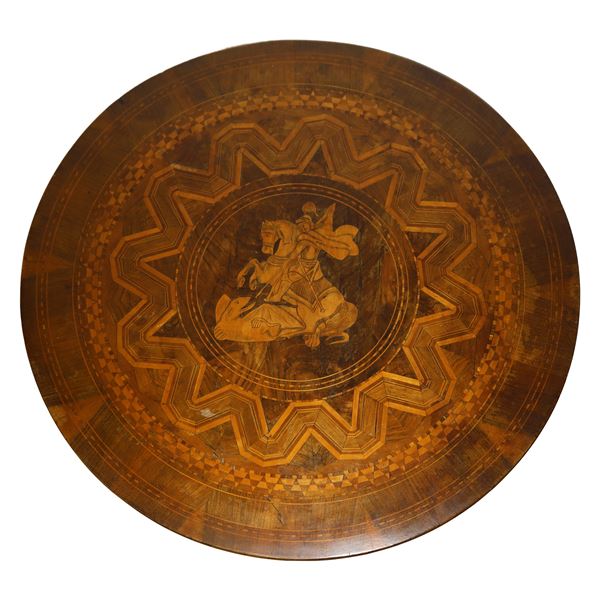 Round walnut table with three-spoke base and top inlaid with geometric motifs in contrasting light woods with a depiction of St. Michael the Archangel in the center, 19th century