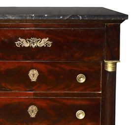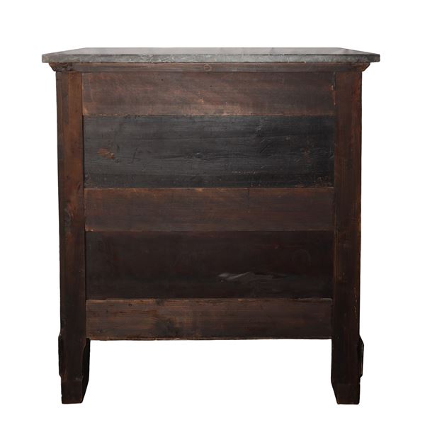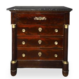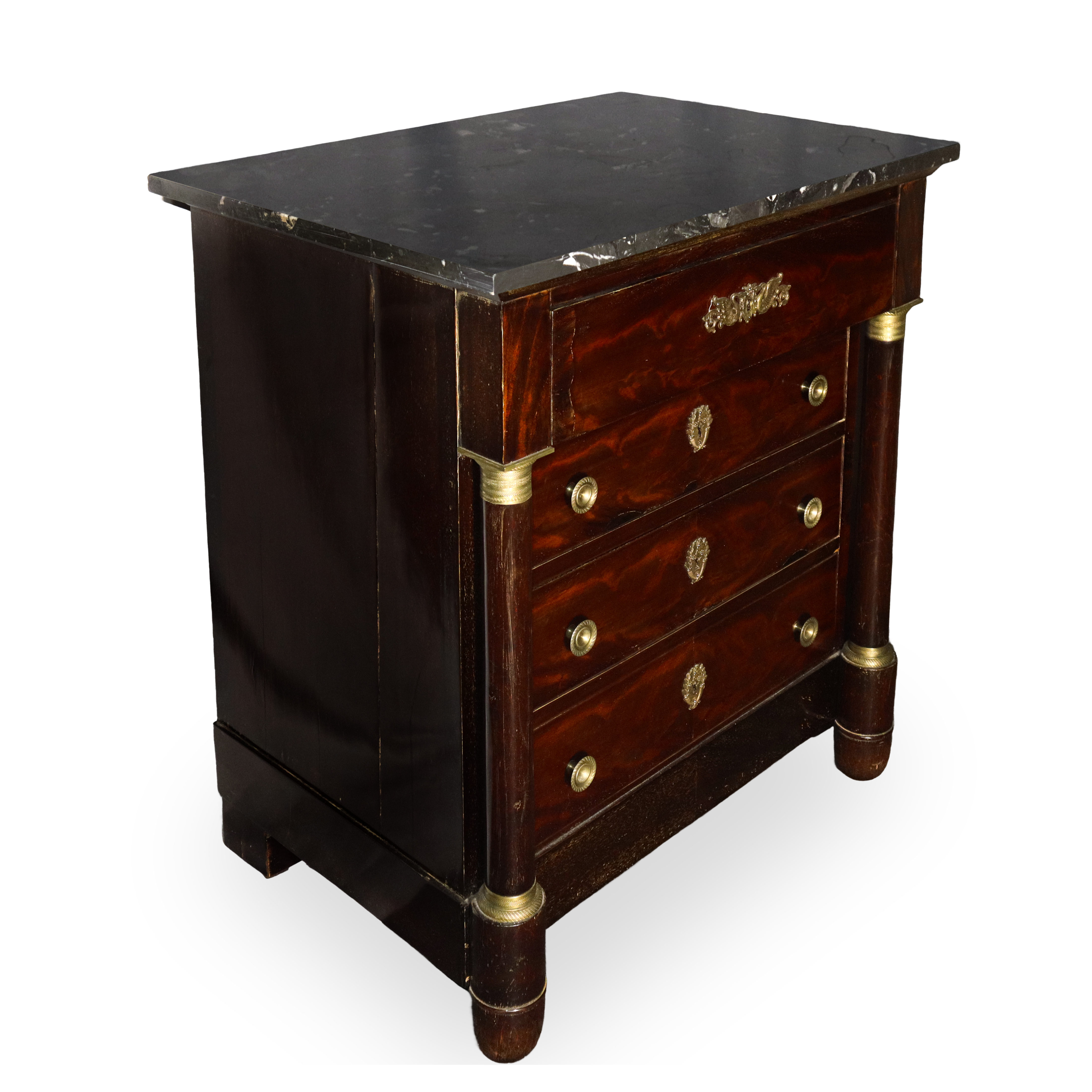 Small Napoleon III chest of drawers with 4 drawers, marble top, applied brass and columns on the sides, France 19th century