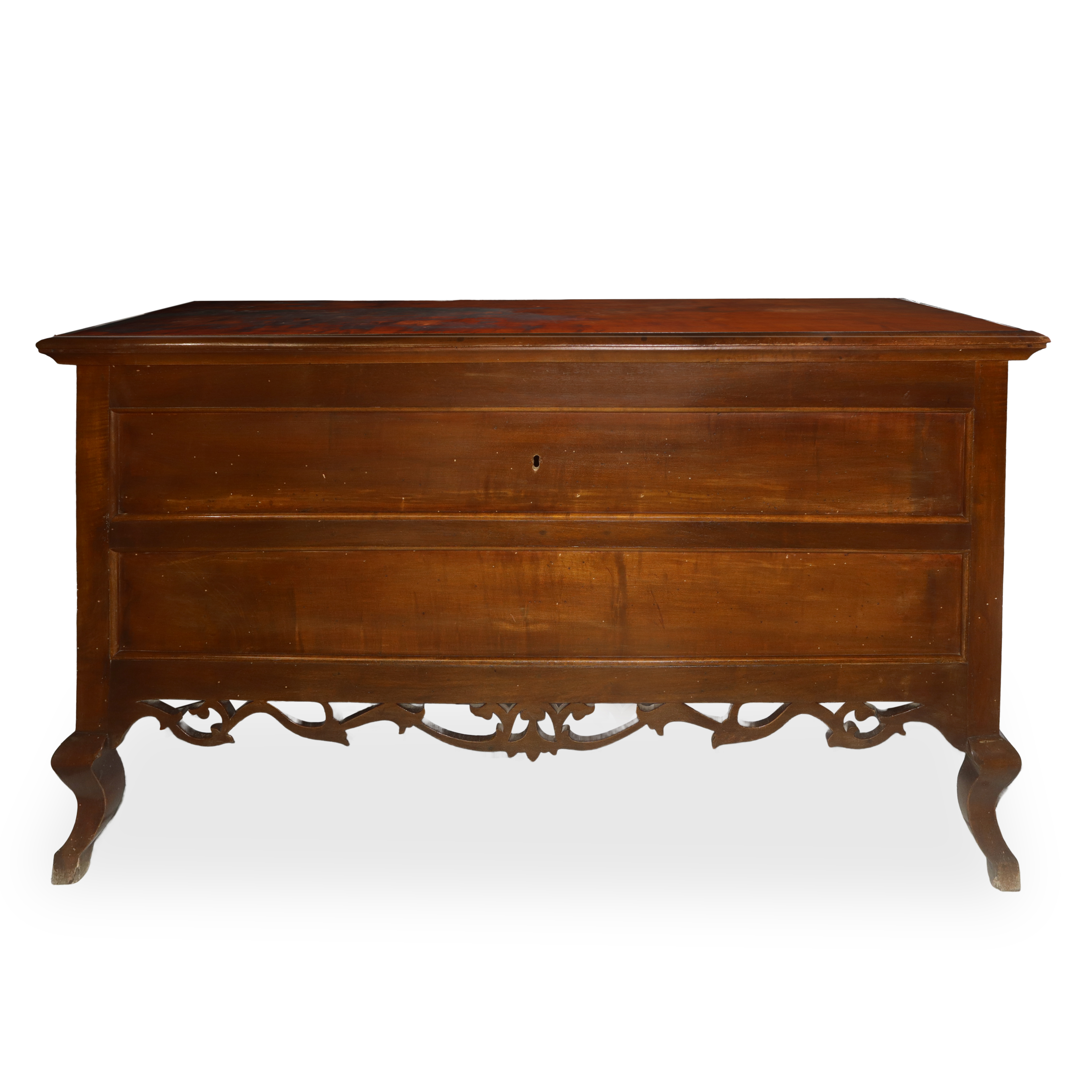 Cabriole feet at the front and truncated pyramid at the back, carved and perforated wood on the front and sides.