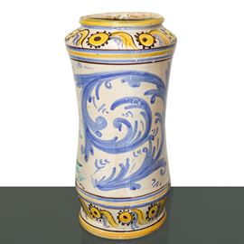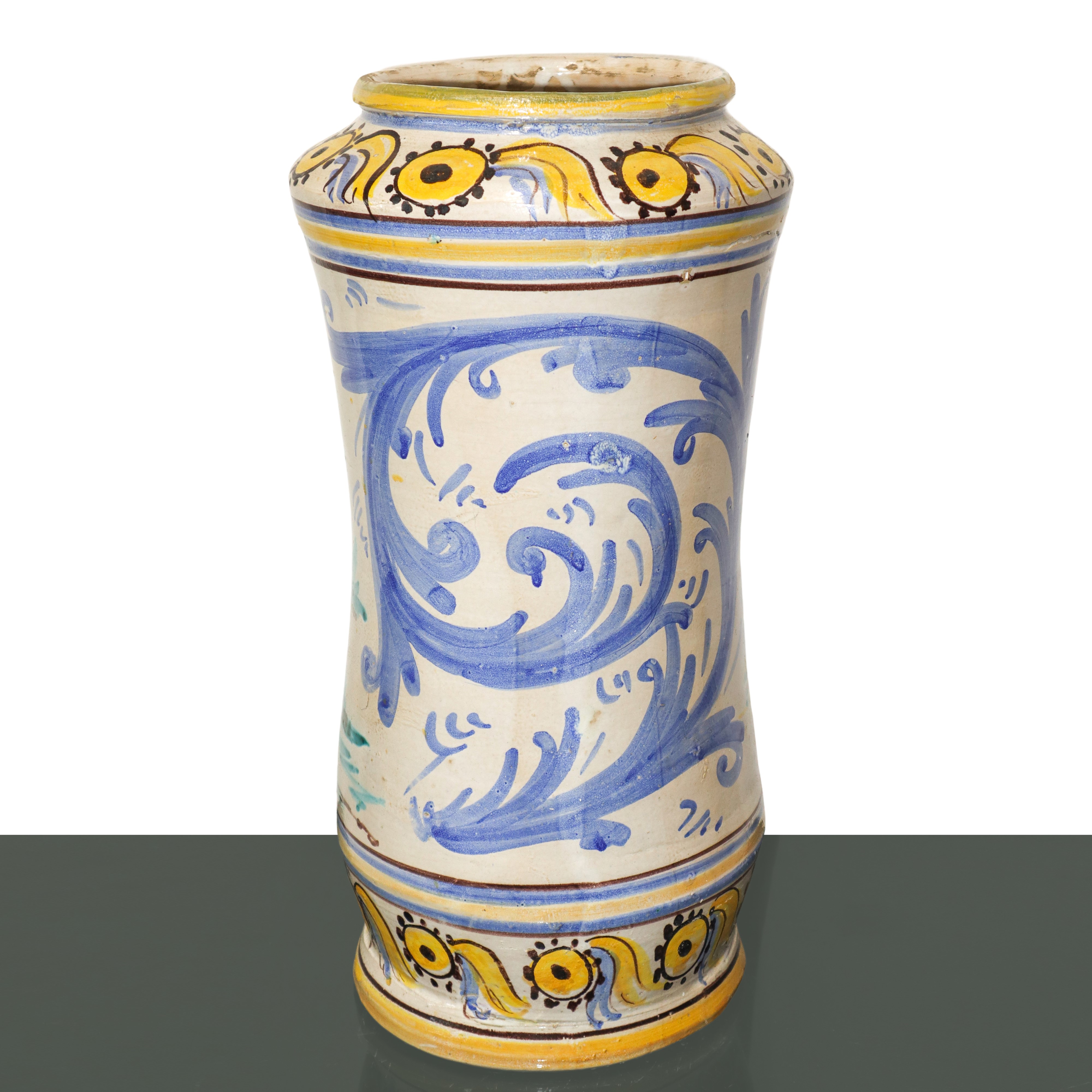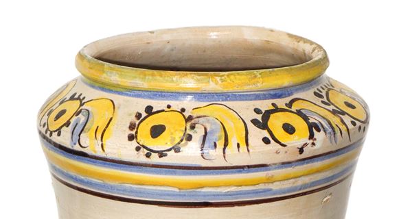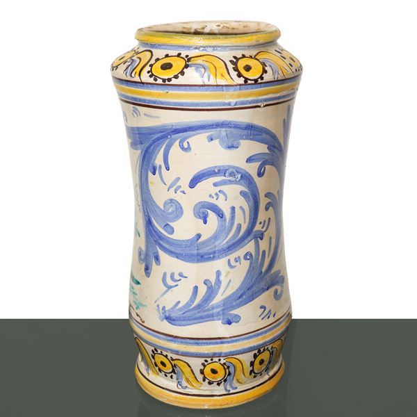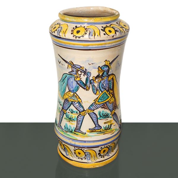 Large Caltagirone majolica cylinder painted in polychrome with a depiction of Sicilian puppets, 20th century