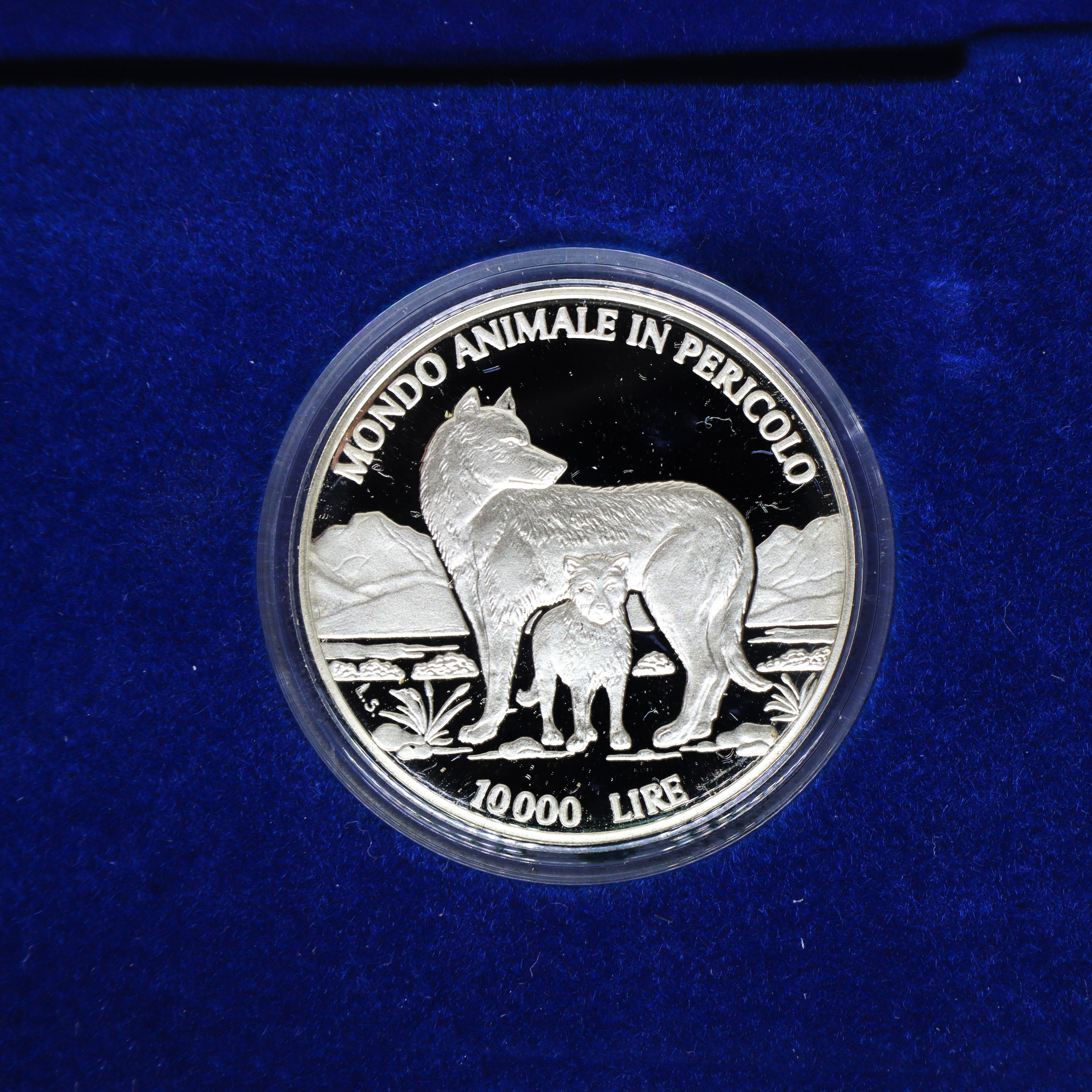 TOWARDS L.10000: A wolf with its cub and in the background a mountain landscape and the legend ANIMAL WORLD IN DANGER 5000 LIRE