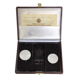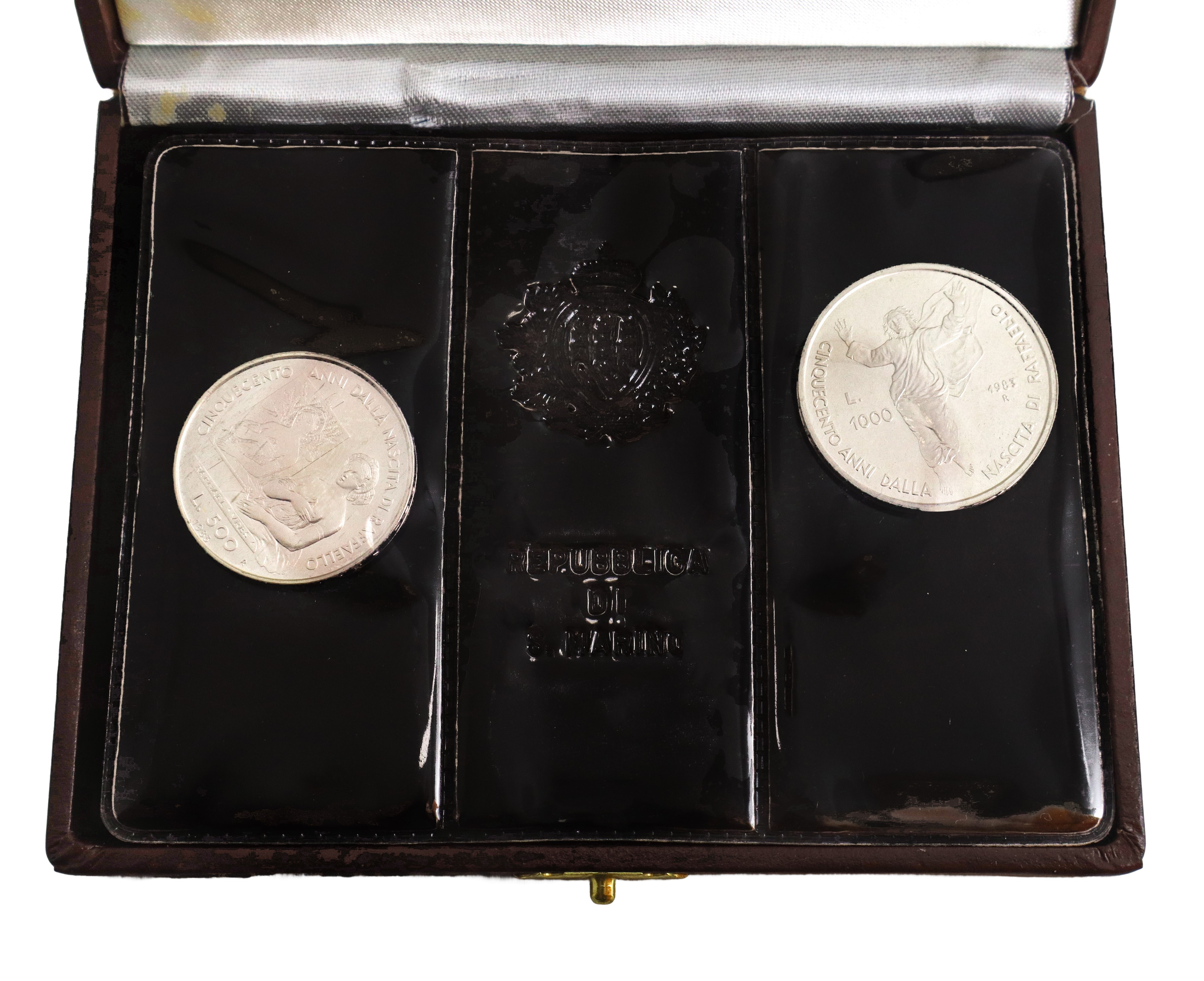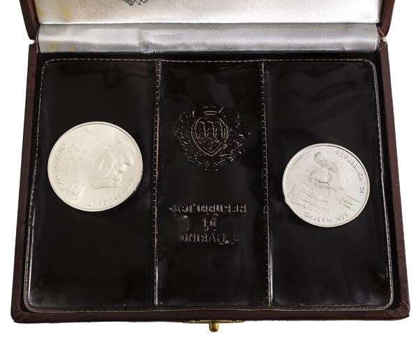 Diptych of legal tender silver coins celebrating the fifth centenary of the birth of Raffaello Sanzio, 1983