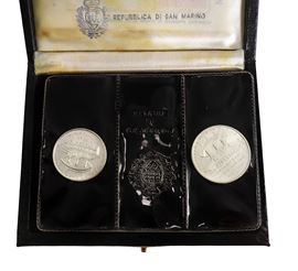 Diptych of legal tender silver coins commemorating the 1st centenary of the death of Giuseppe Garibaldi, 1982
