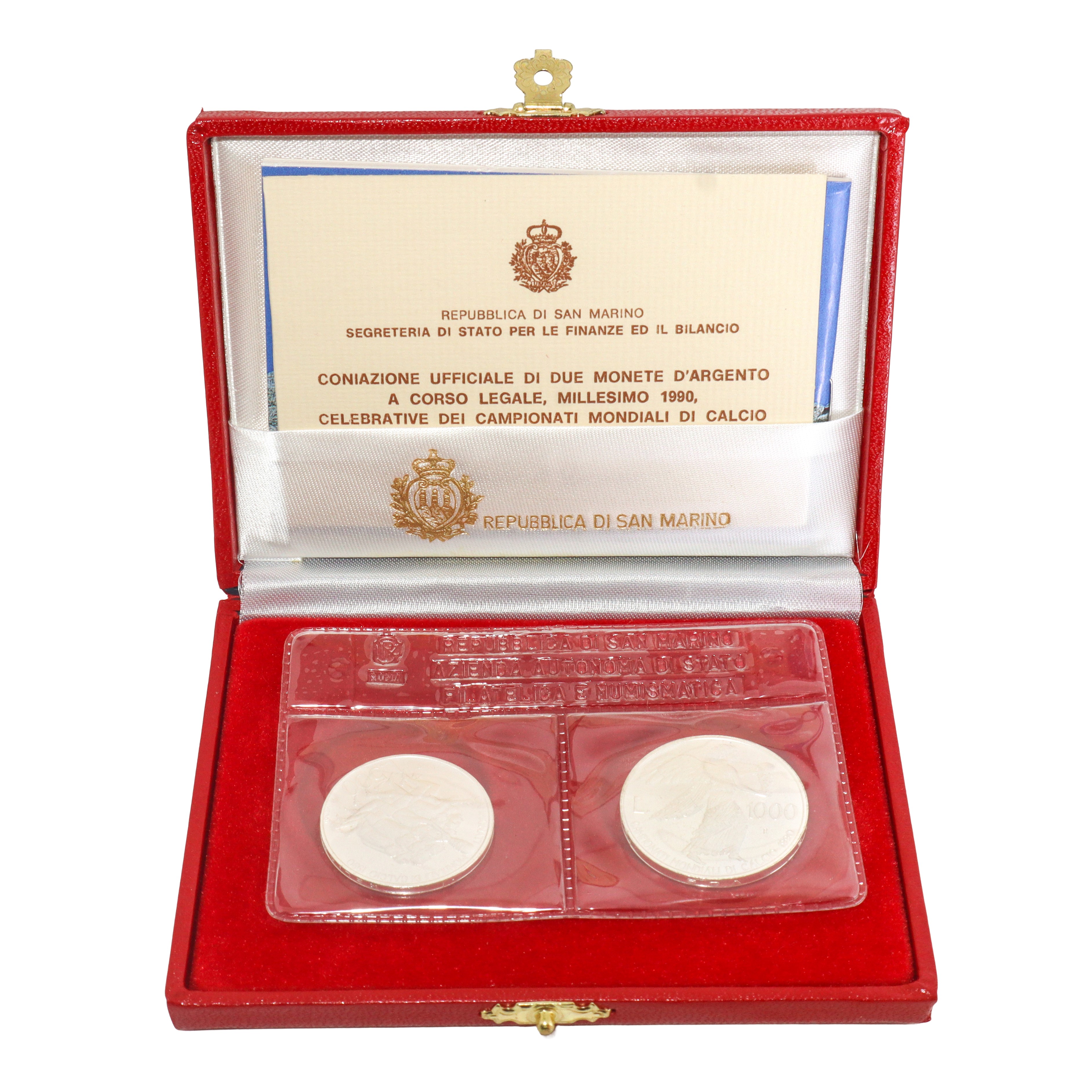 Diptych of legal tender silver coins commemorating the football world cup, 1990