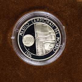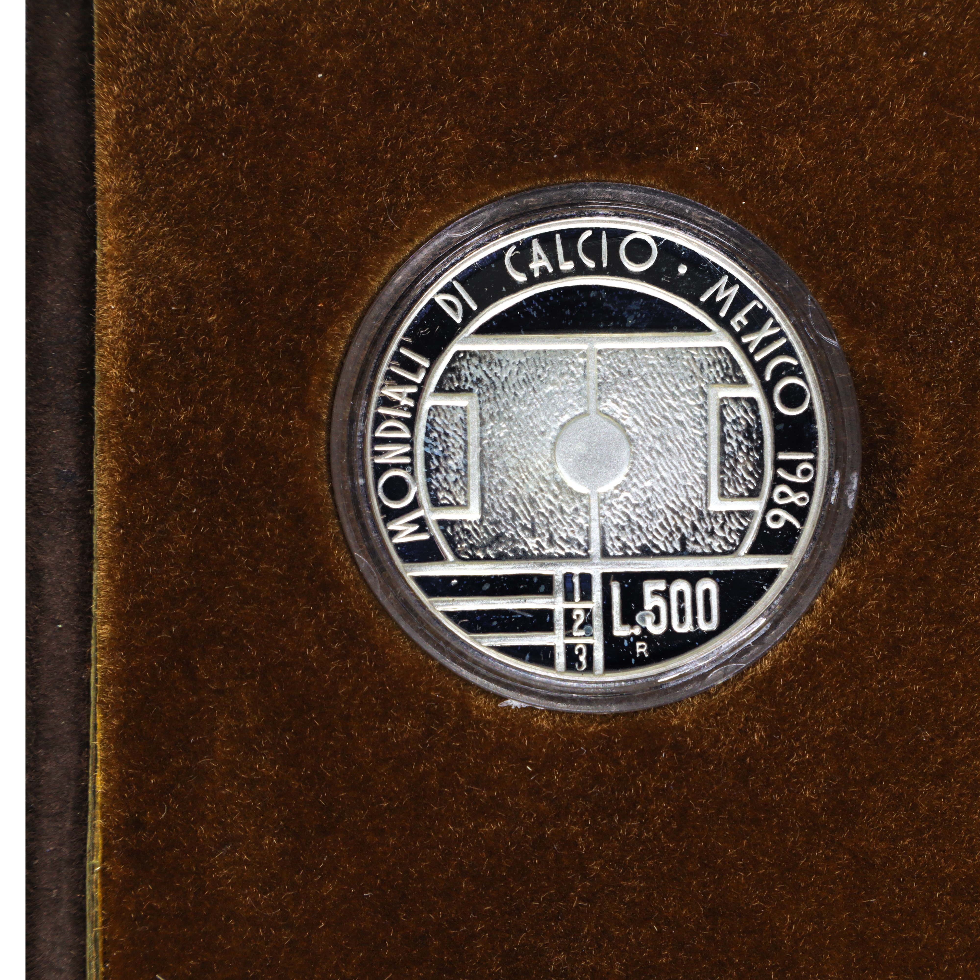 Diptych of legal tender silver coins commemorating the football world championships, 1986
