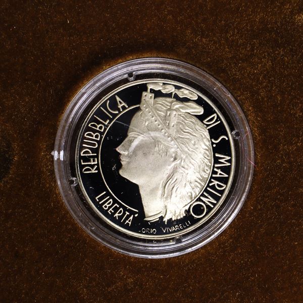 Obverse of the coins: Female figure in profile with the three stylised towers and the inscription "REPUBBLICA DI SAN MARINO" "LIBERTA'" and the name of the artist of the sketch.