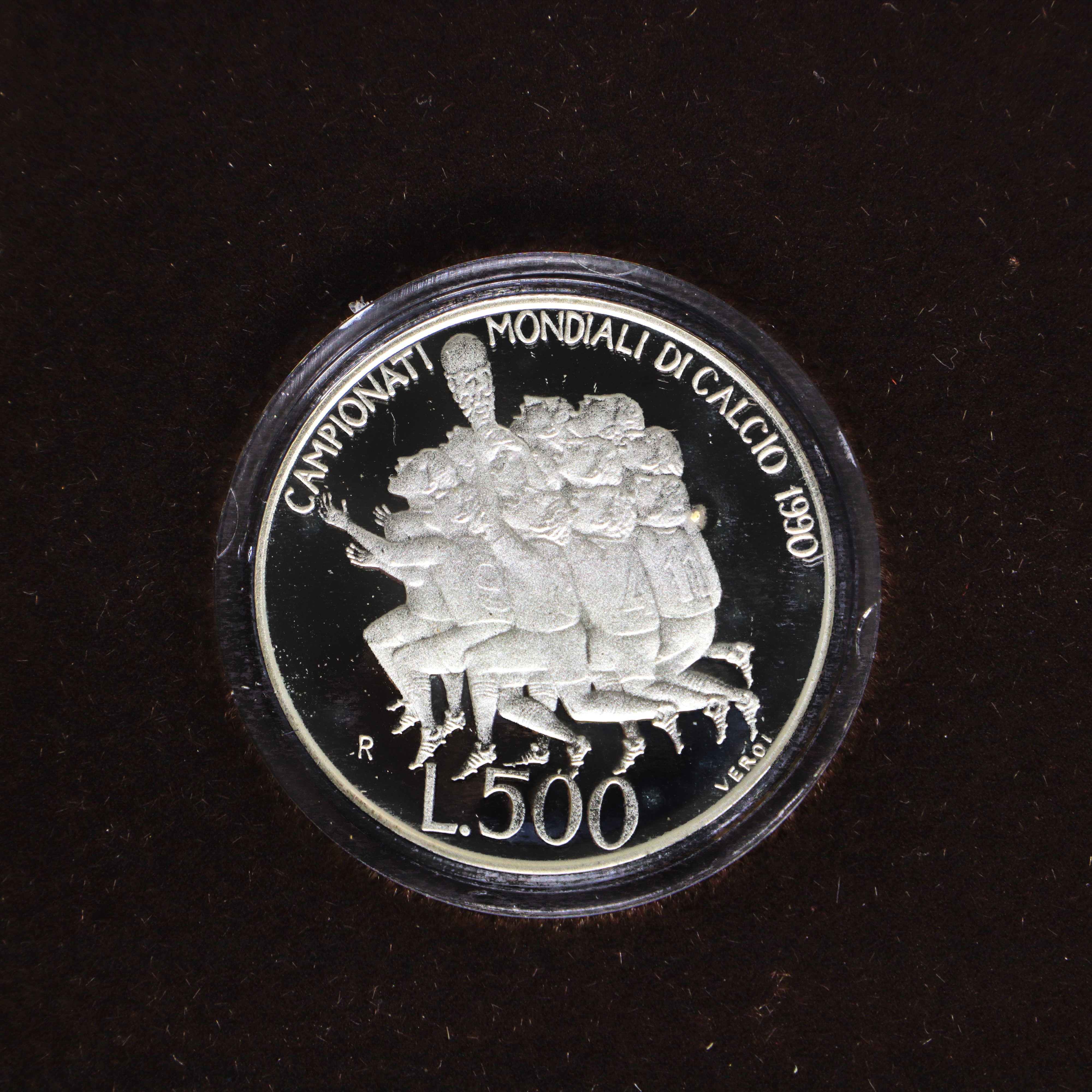 Diptych of legal tender silver coins commemorating the football world cup, 1990