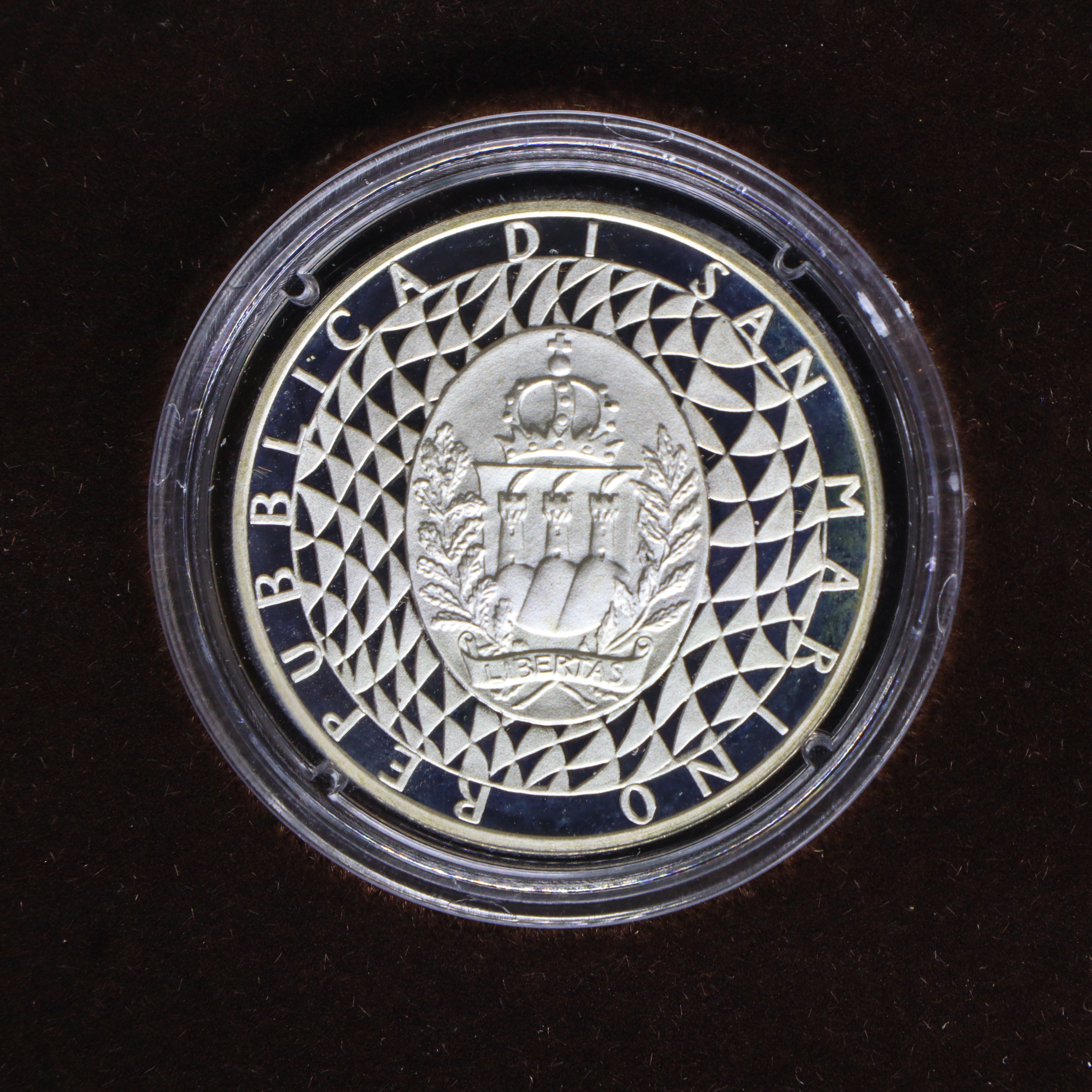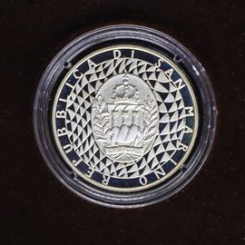 OBVERSE OF THE COINS: Coat of arms of the Republic with the goalkeeper's net behind it and the legend REPUBLIC OF SAN MARINO around it.