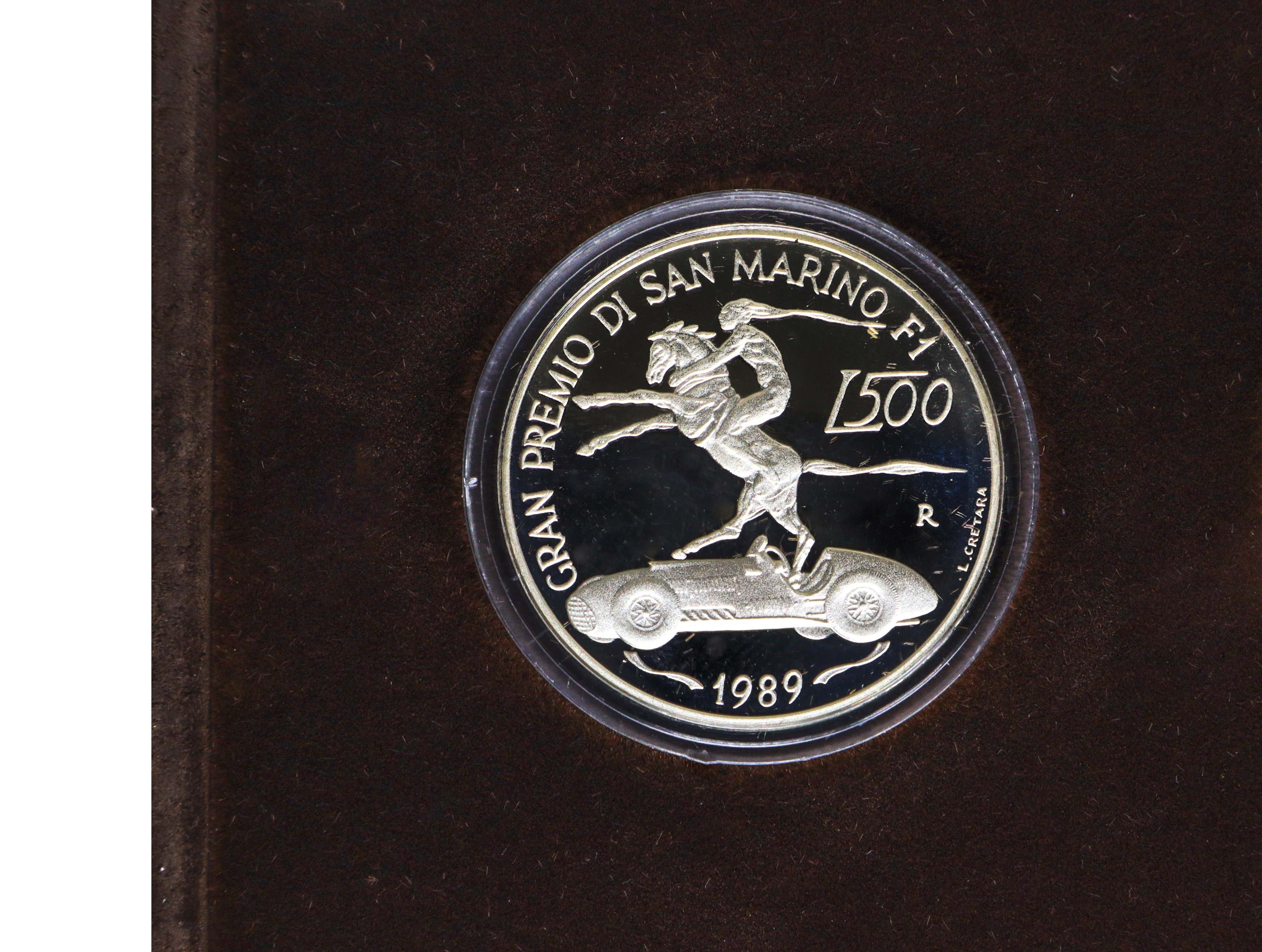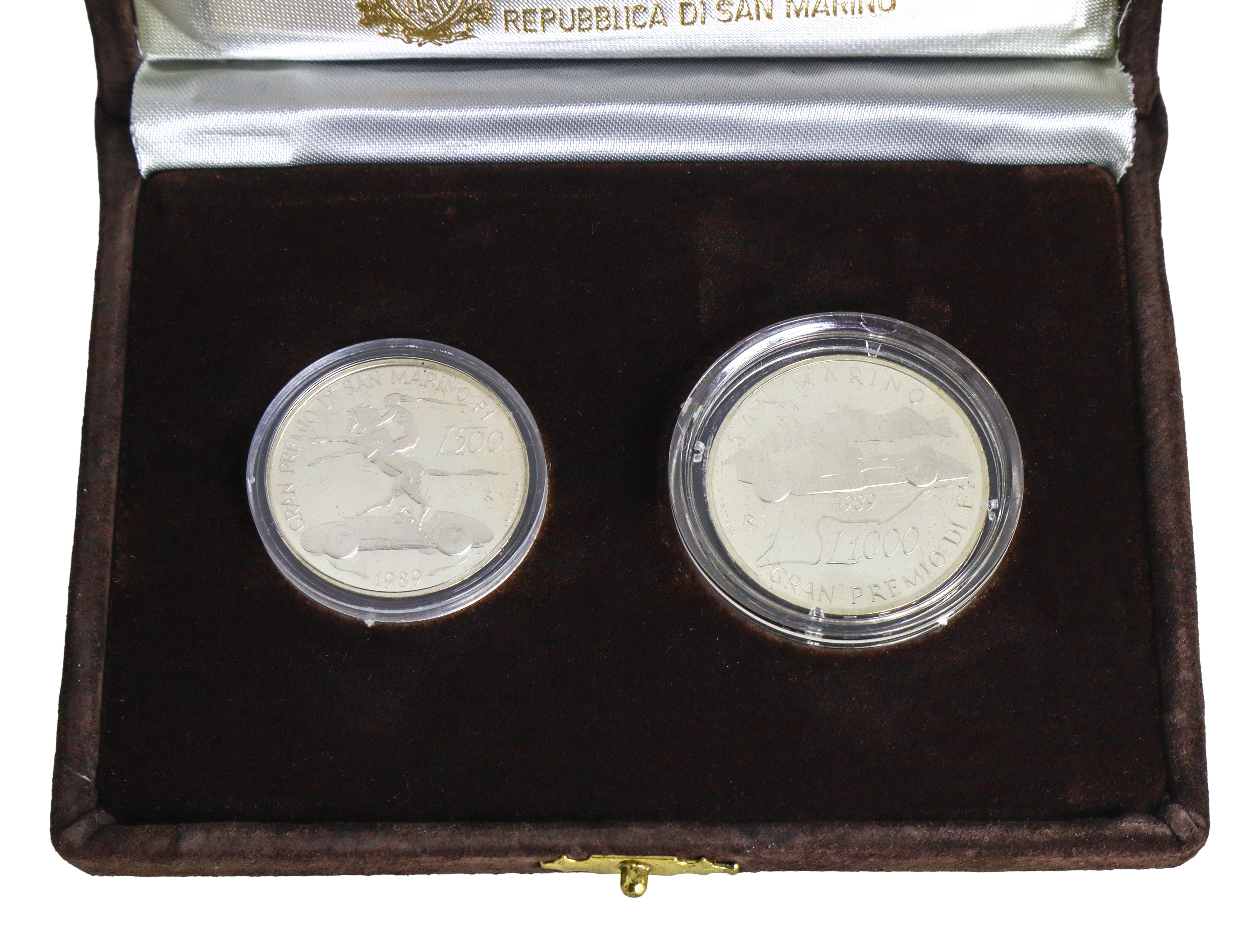 Diptych of legal tender silver coins commemorating the San Marino Formula One Grand Prix, 1989