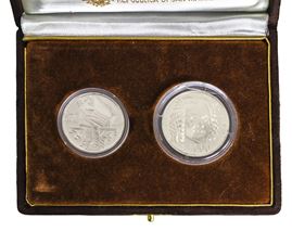Diptych of legal tender silver coins commemorating the third centenary of the birth of Johann Sebastian Bach, 1985