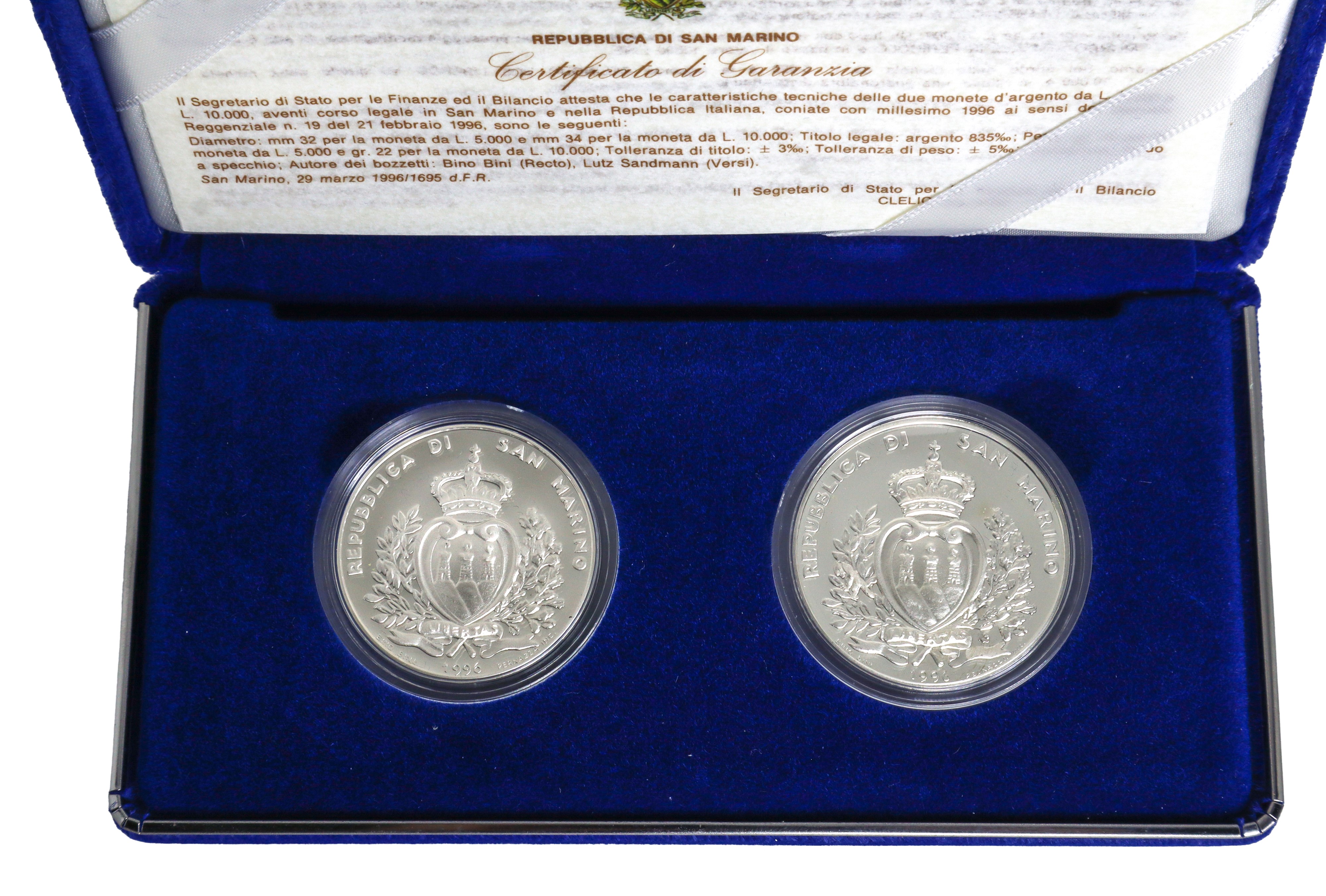 Legal title 835% silver L.5000: GR.18 diameter mm. 32 L.10000: GR.22 diameter mm. 34