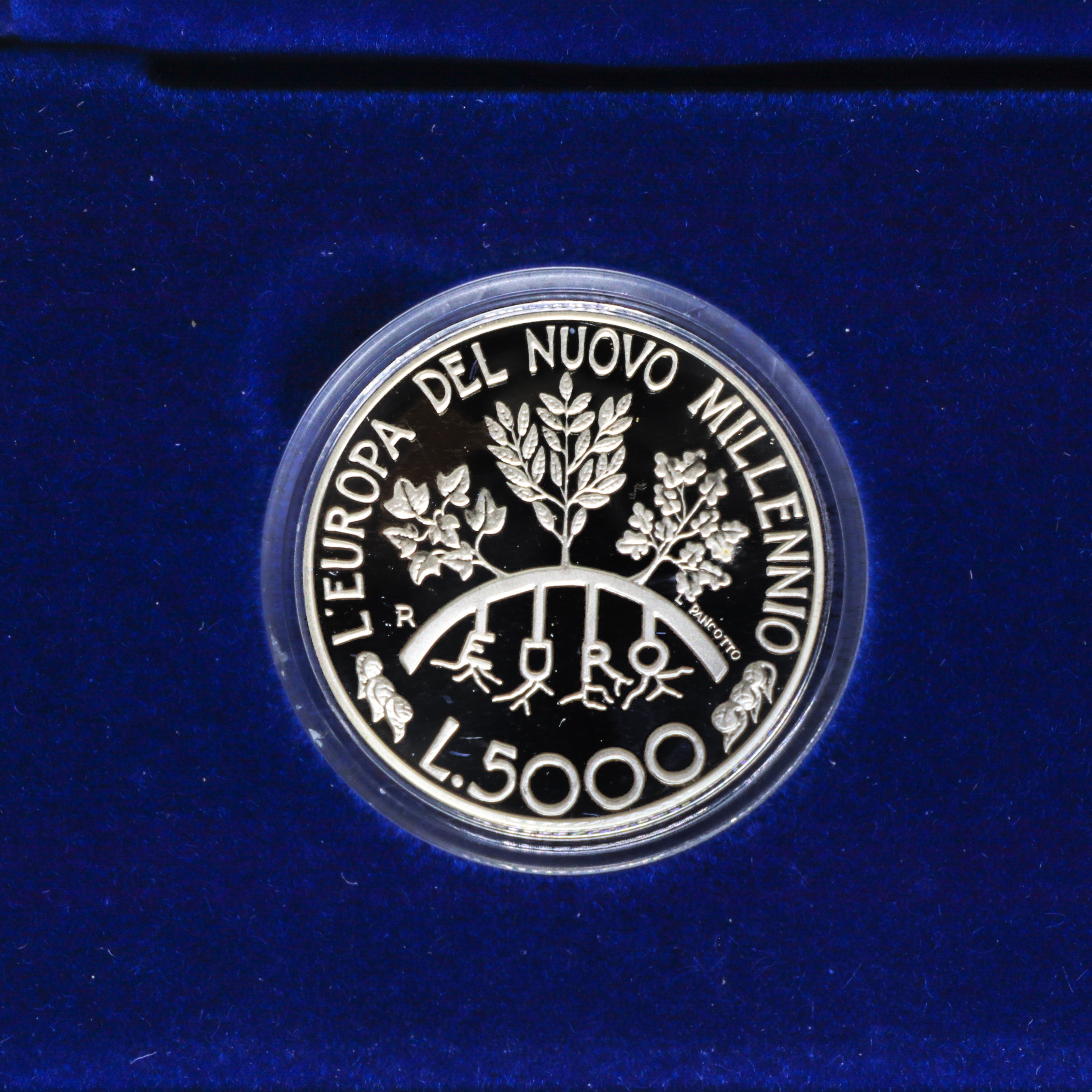 TOWARDS L.5000: Three plants (ivy, olive tree and oak) that have their roots in the word EURO, around the legend EUROPE TOWARDS THE NEW MILLENNIUM L.5000 L.PANCOTTOBORDER: RELINQUO VOS LIBEROS