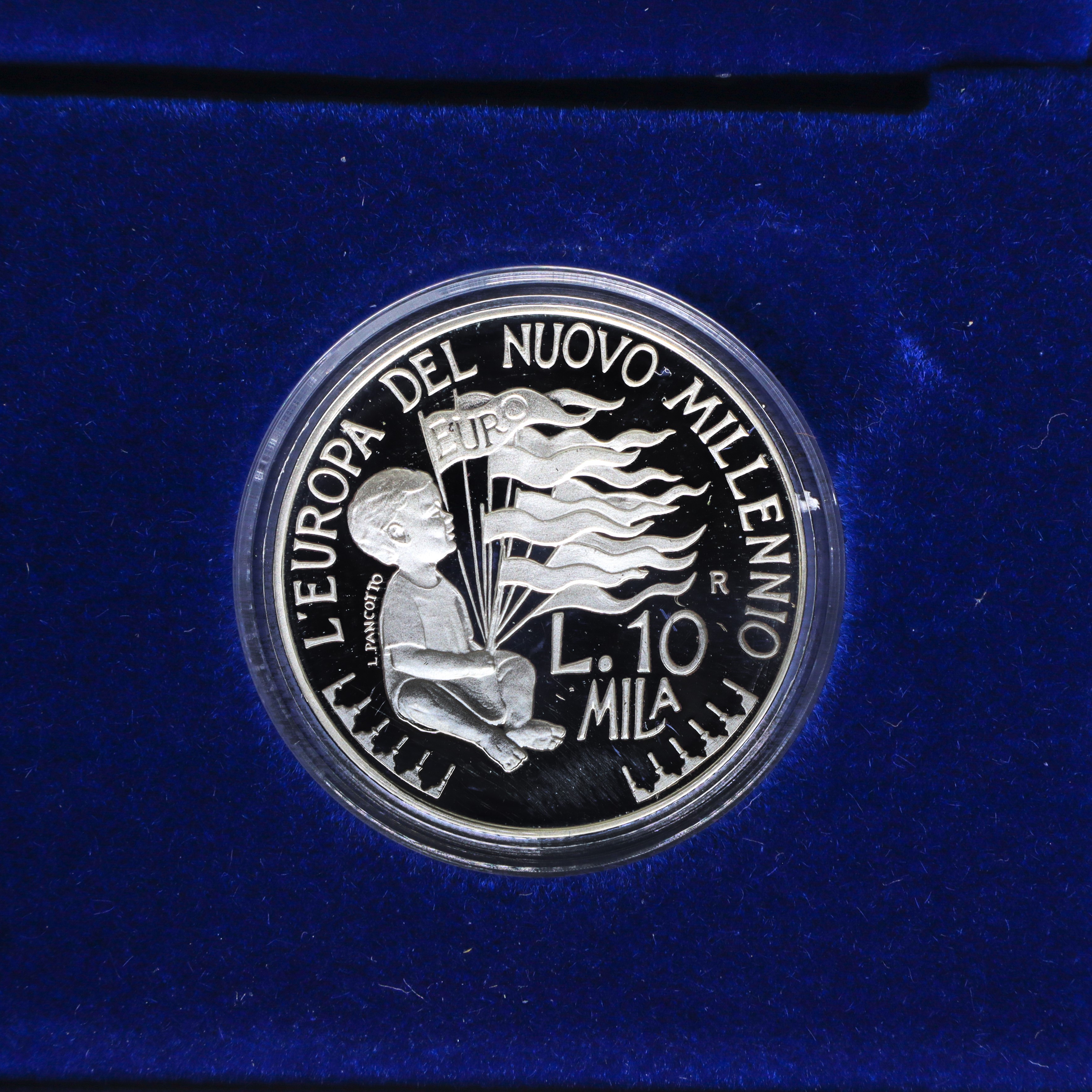 TOWARDS L.10000: Child holding the flagpoles and the twelve flags on which the word EURO dominates, around which the legend EUROPE TOWARDS THE NEW MILLENNIUM L.10000 L.PANCOTTO