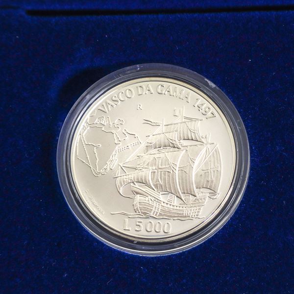 COIN REVERSE L.5000: Vasco da Gama's ship with the route of the voyage next to it and the inscription VASCO DA GAMA 1497 L.5000 L.SANDMANN (author of the sketch)BORDER: RELINQUO VOS LIBEROS
