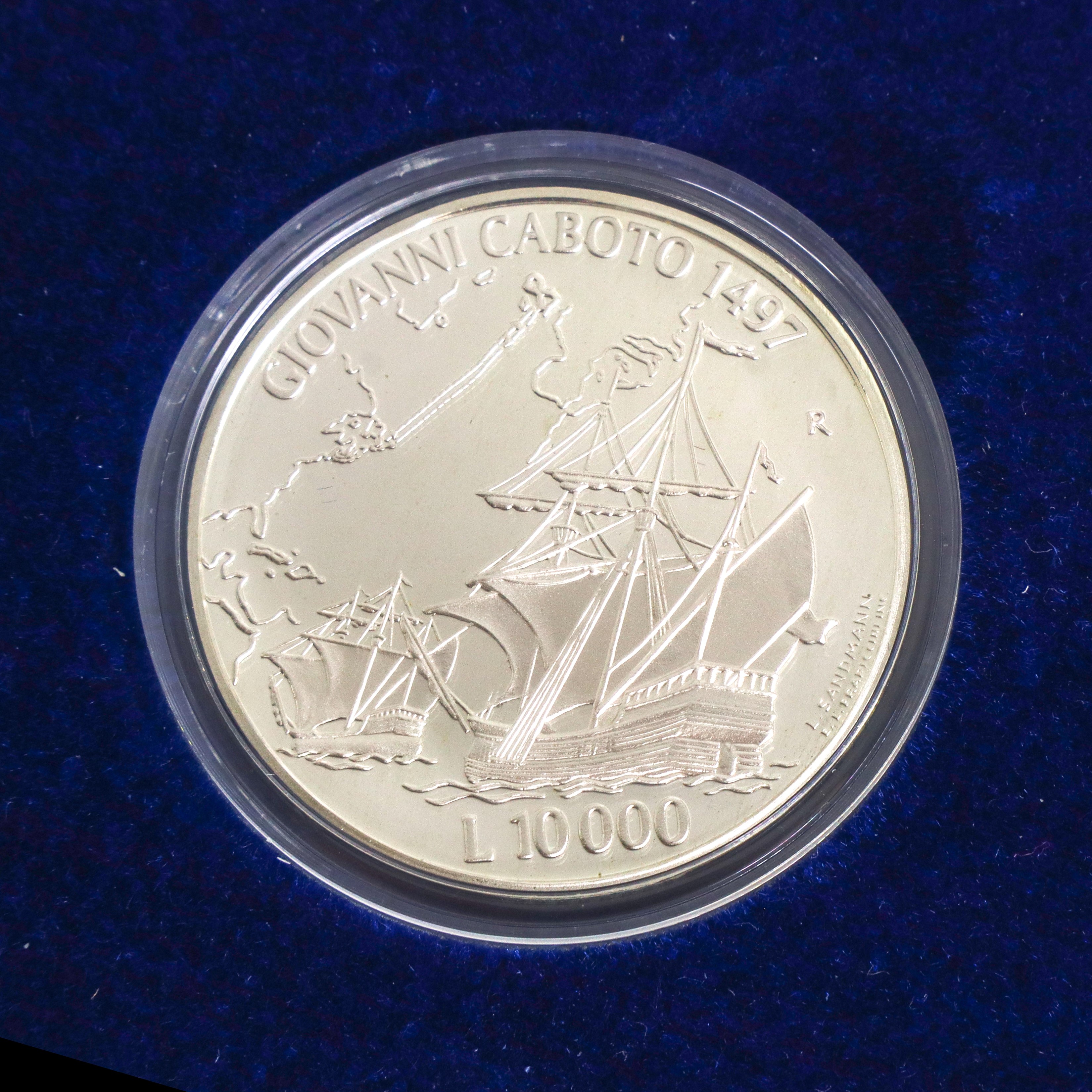 COIN REVERSE L.10000: Ship of John Cabot with the route of his voyage and the legend JOHN CABOTO 1497 L.10000, L.SANDMANN (author of the sketch)