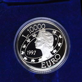 COIN REVERSE: Coat of arms of the Republic of San Marino symbolized by a female head surrounded by 12 stars with the value L.10000 at the top and the inscription EURO at the bottom