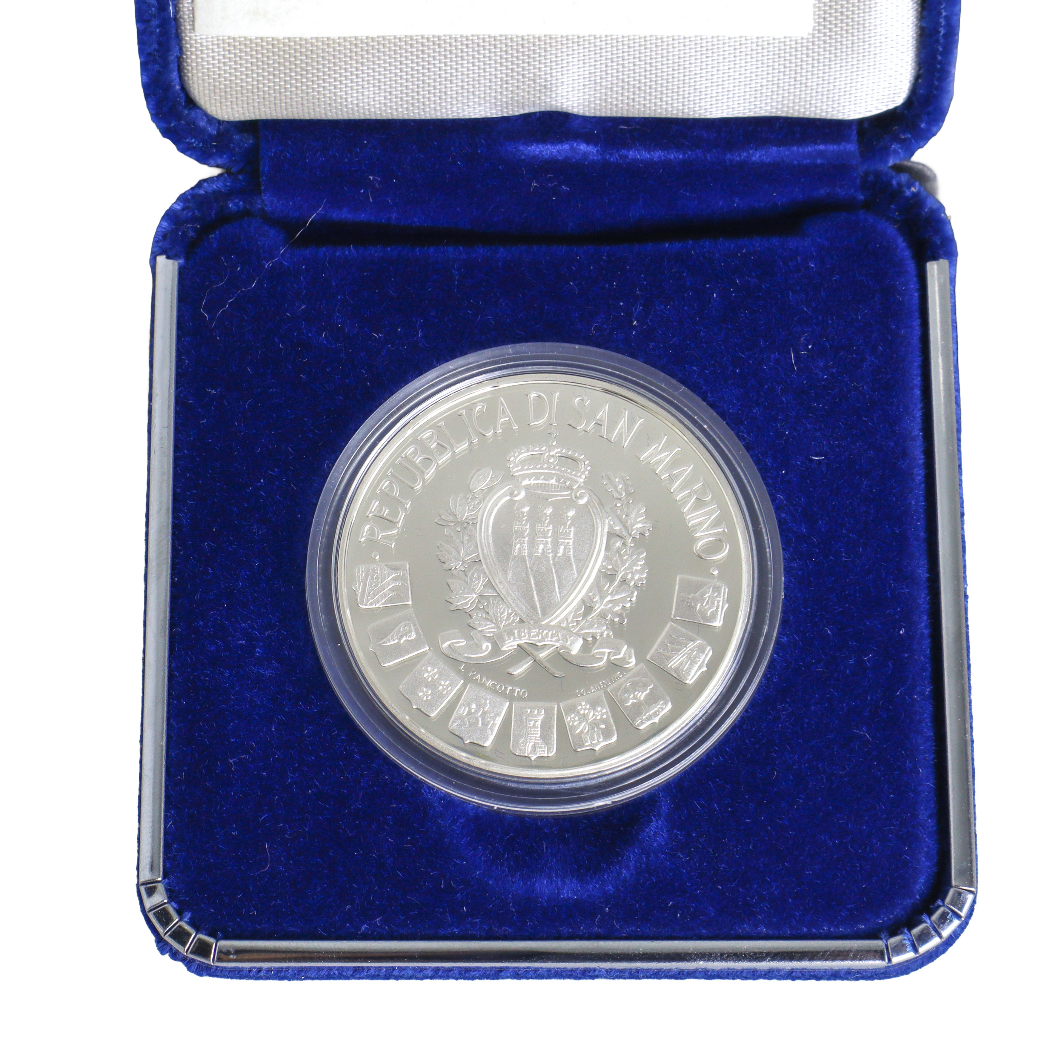 FRONT: Coat of arms of the Republic of San Marino surrounded by the legend Republic and the coats of arms of the 9 Castles of San Marino