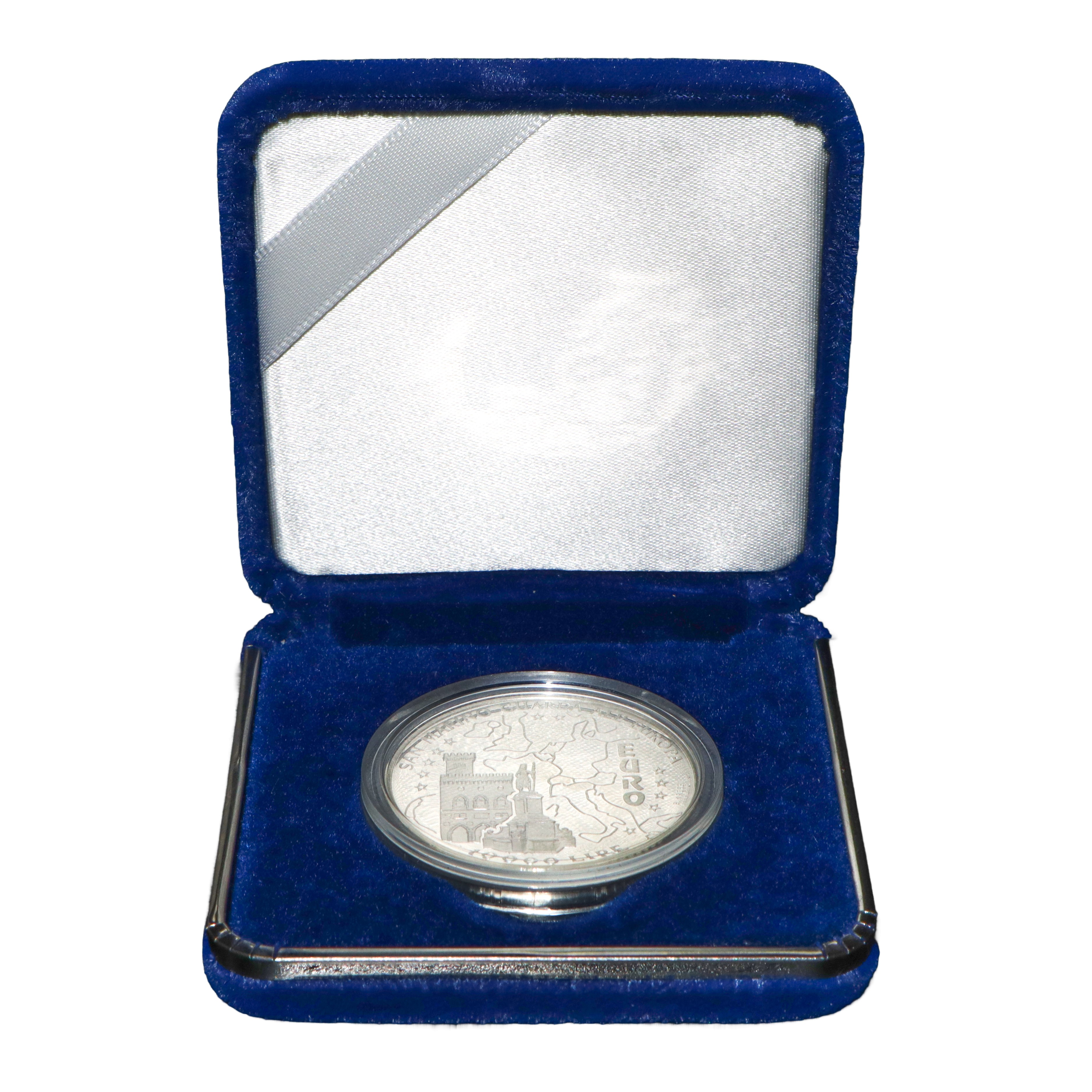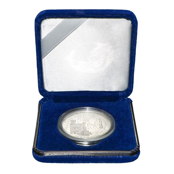COIN REVERSE: Foreground: Statue of Liberty and the Palazzo Pubblico; in the background, the geographical profile of the European continent surrounded by 12 stars; to the right, the word euro surrounded by the legend SAN MARINO/A PART OF EUROPE L.10000. BERND KREEB (designer)