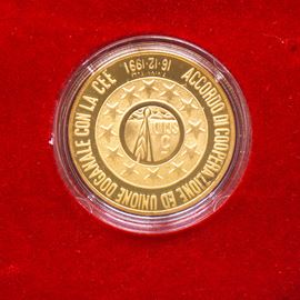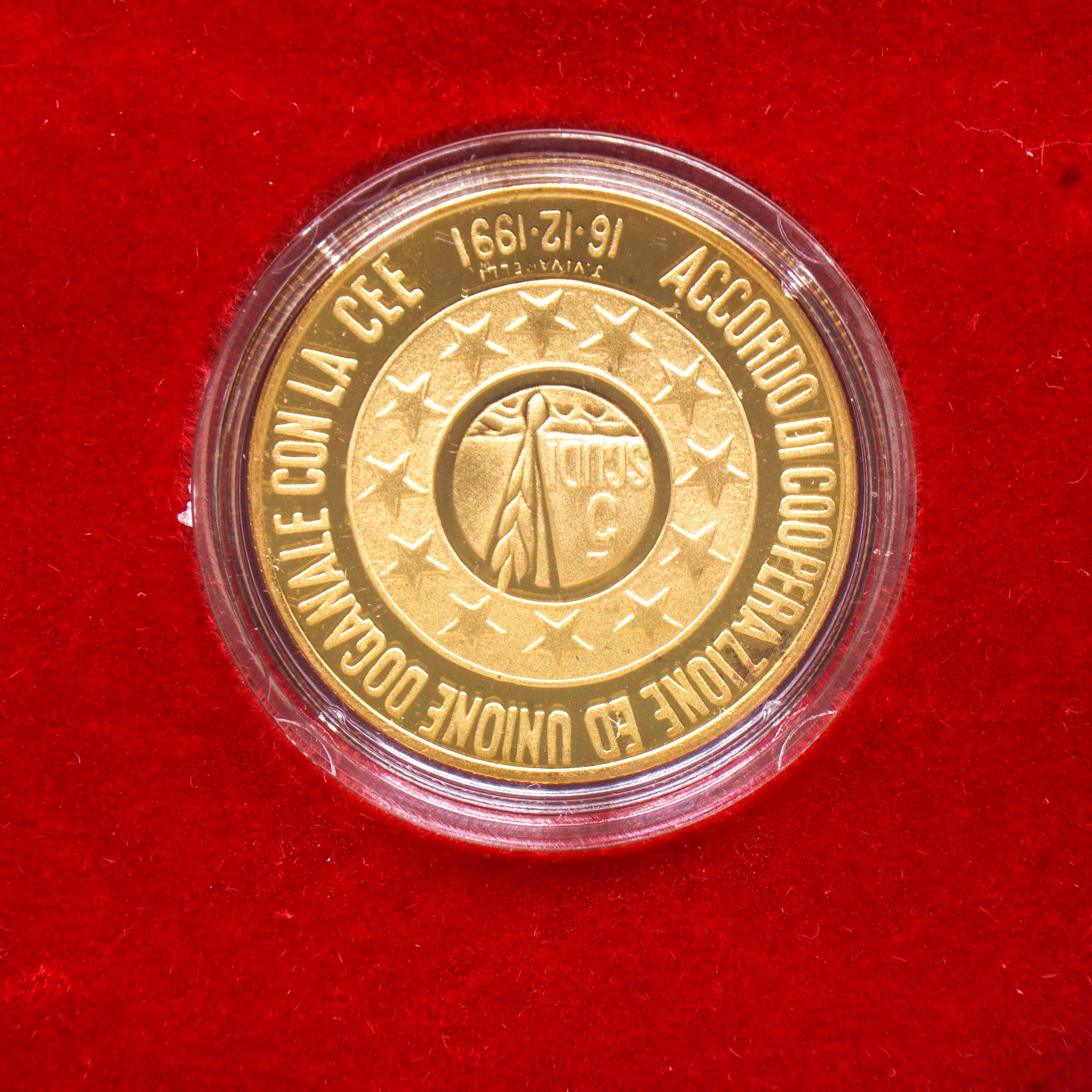 COIN REVERSE: Wheat sprout with the value 5 SCUDI on the left with the 12 stars symbolizing the European Community around it and the legend COOPERATION AND CUSTOMS UNION AGREEMENT WITH THE EEC 16/1271991 around it.