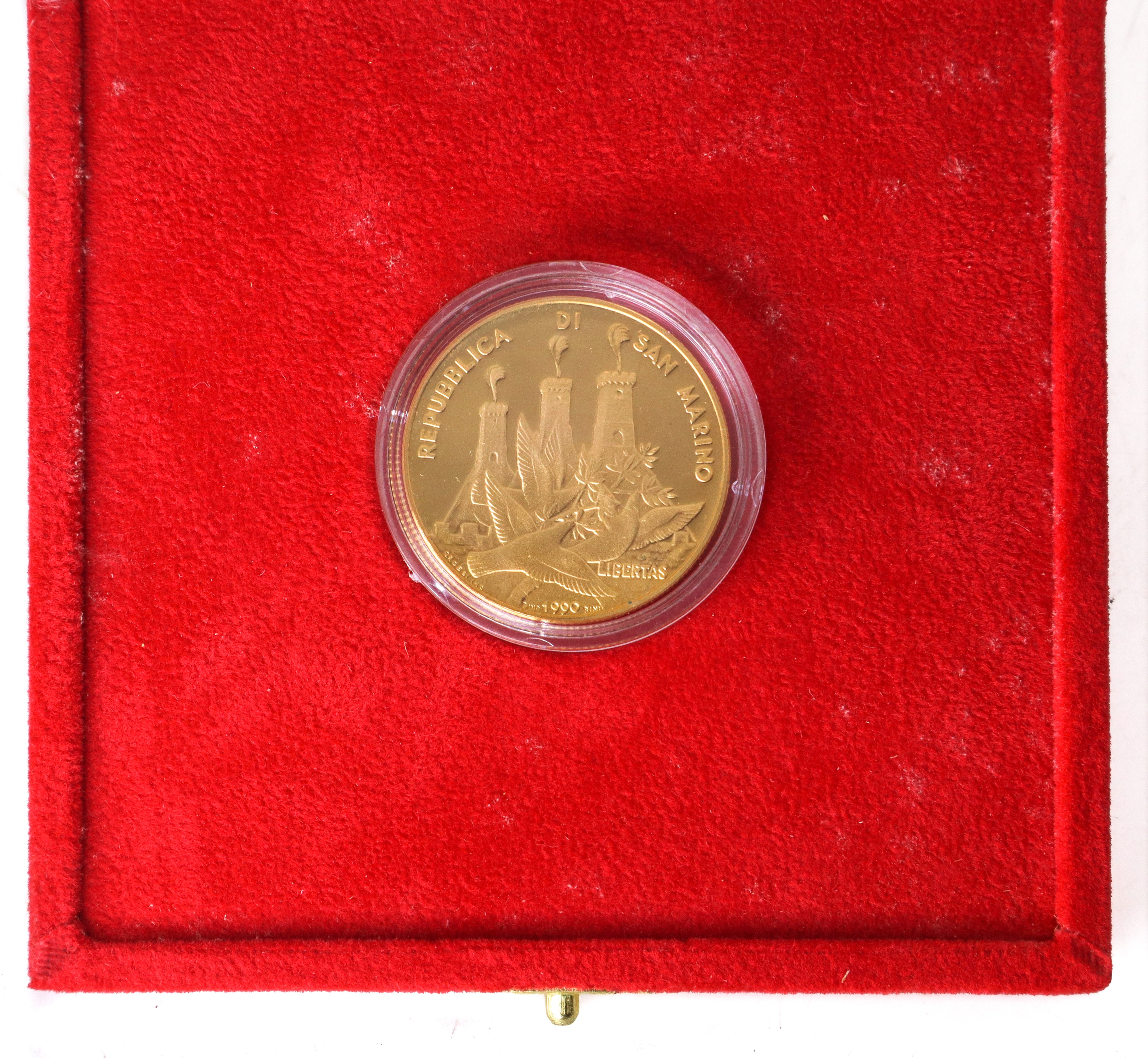 COIN OBVERSE: Official coat of arms of the Republic of San Marino with the legend REPUBBLICA DI SAN MARINO around it, and LIBERTAS 1990 BINO BINI at the bottom.