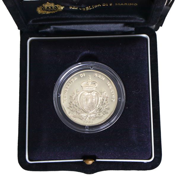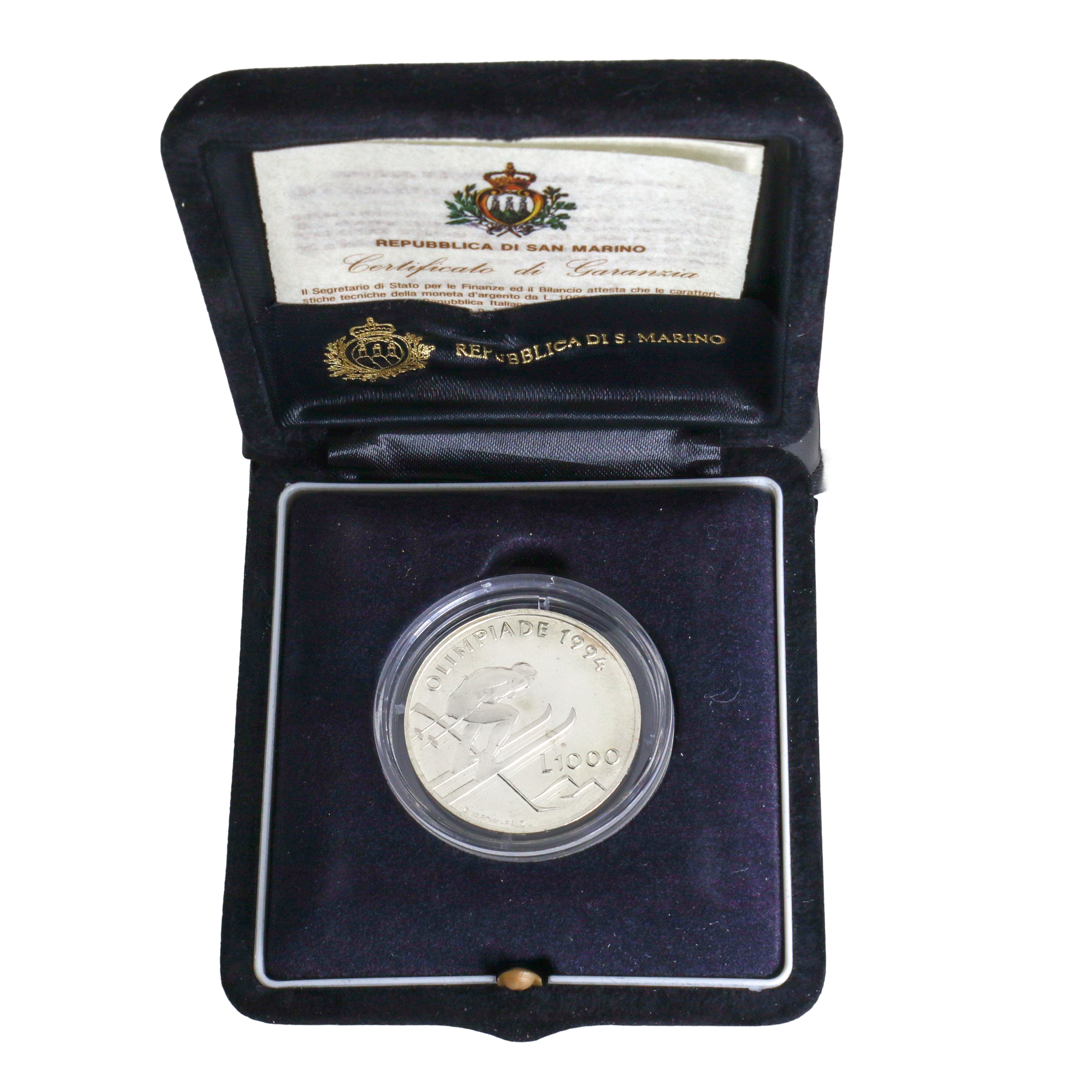 COIN REVERSE: The figure of a skier with mountain peaks in the background and the legend OLIMPIADE 1994 L.1000 and the author of the sketch D.WASCHK-BALZ