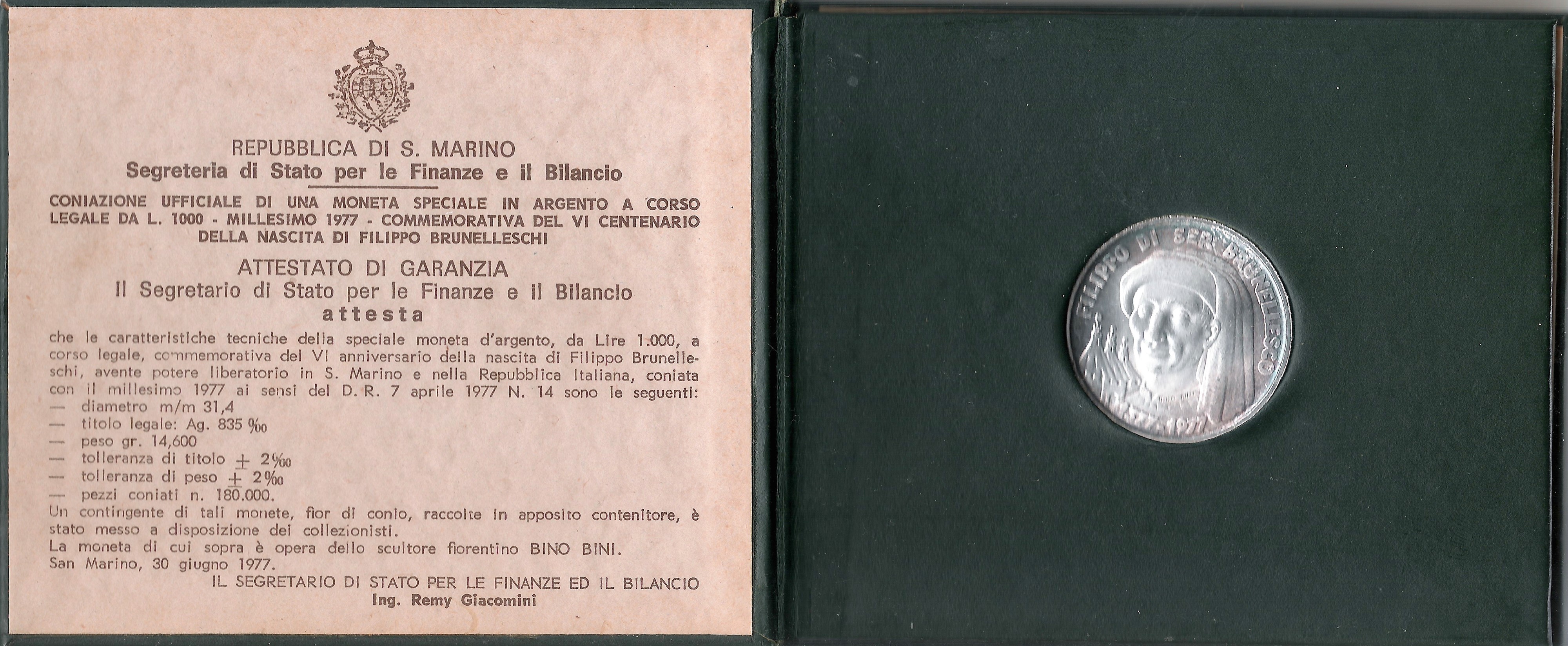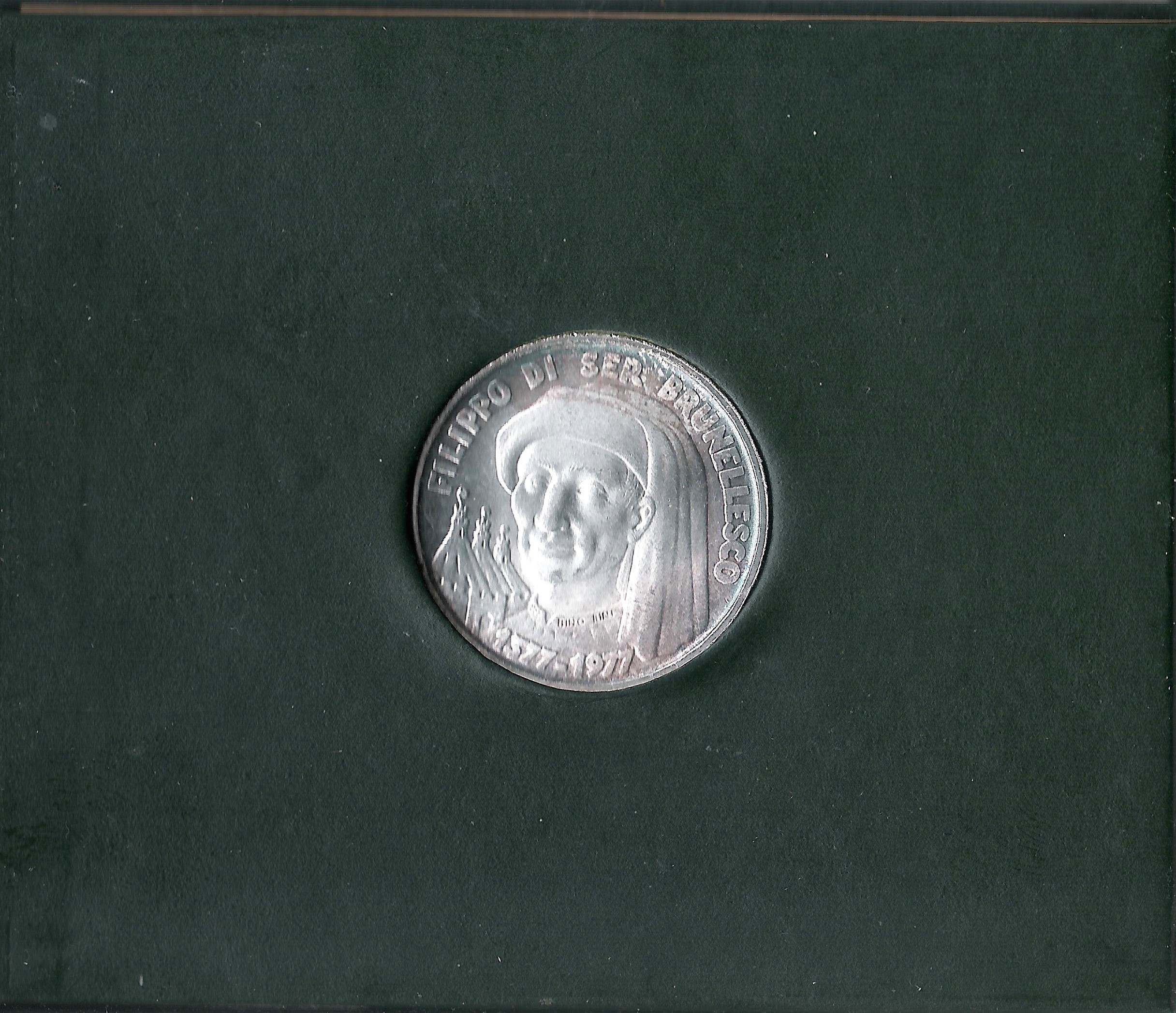 Official minting of a special legal tender silver coin of L.1000 Millesimo 1977 commemorating the sixth centenary of the birth of Filippo Brunelleschi, 1977