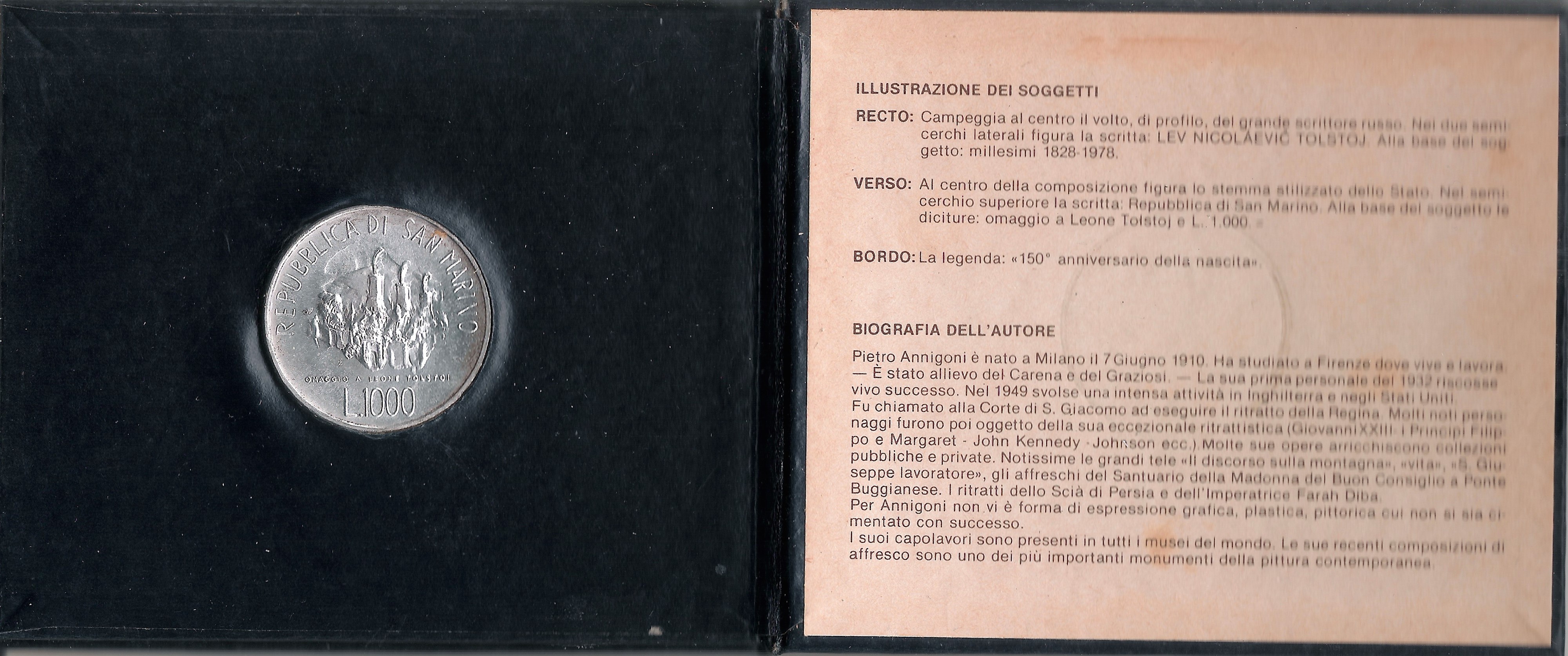 Official minting of a special legal tender silver coin of L.1000 Millesimo 1978 commemorating the 150th anniversary of the birth of Leo Tolstoy, 1978