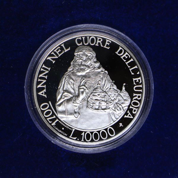 COIN BACK: Guercino's SAN MARINO surrounded by the legend "1700 YEARS IN THE HEART OF EUROPE! L.10,000 CANAPICCHI (sketch artist) PERNAZZA (engraver)COIN EDGE: Alternating knurling