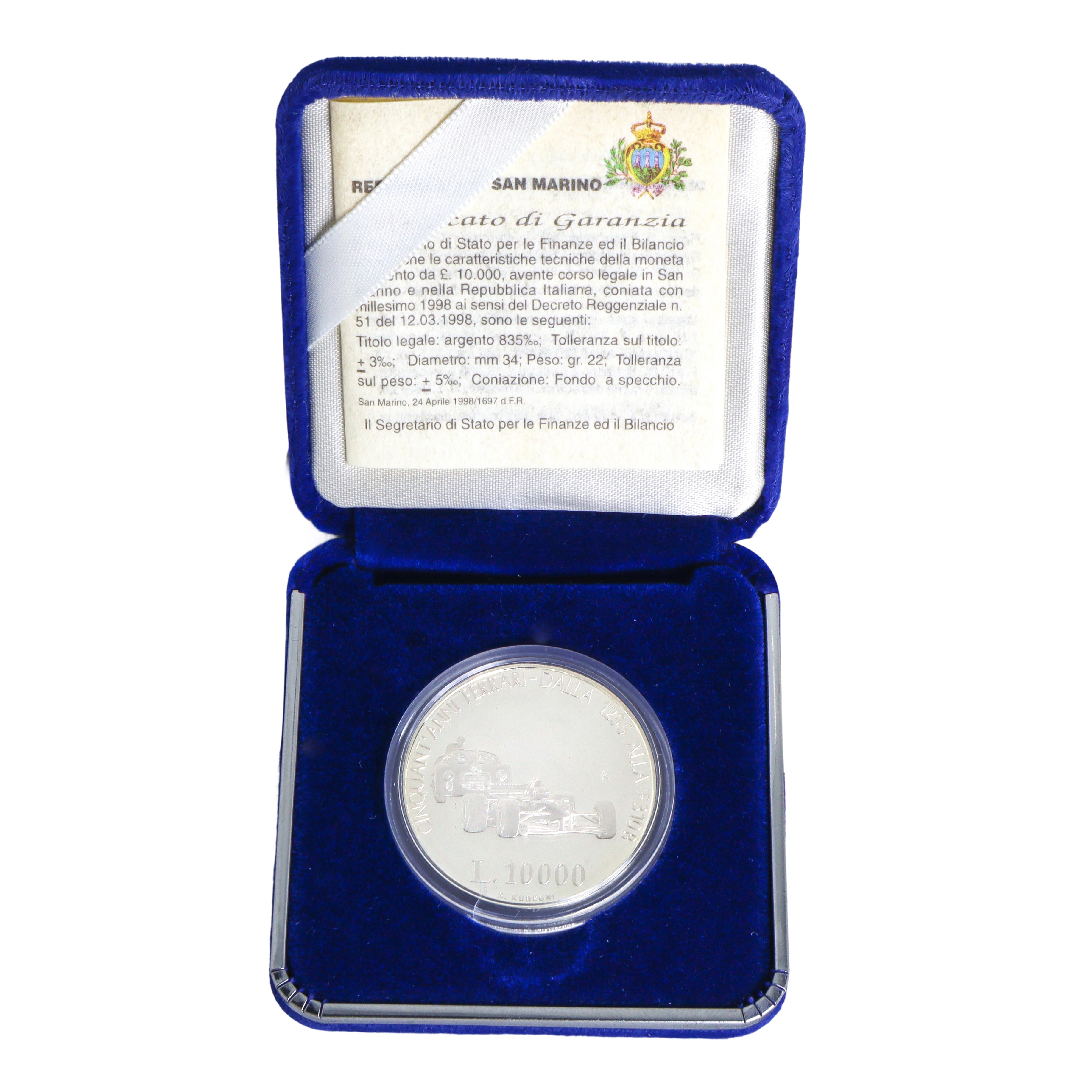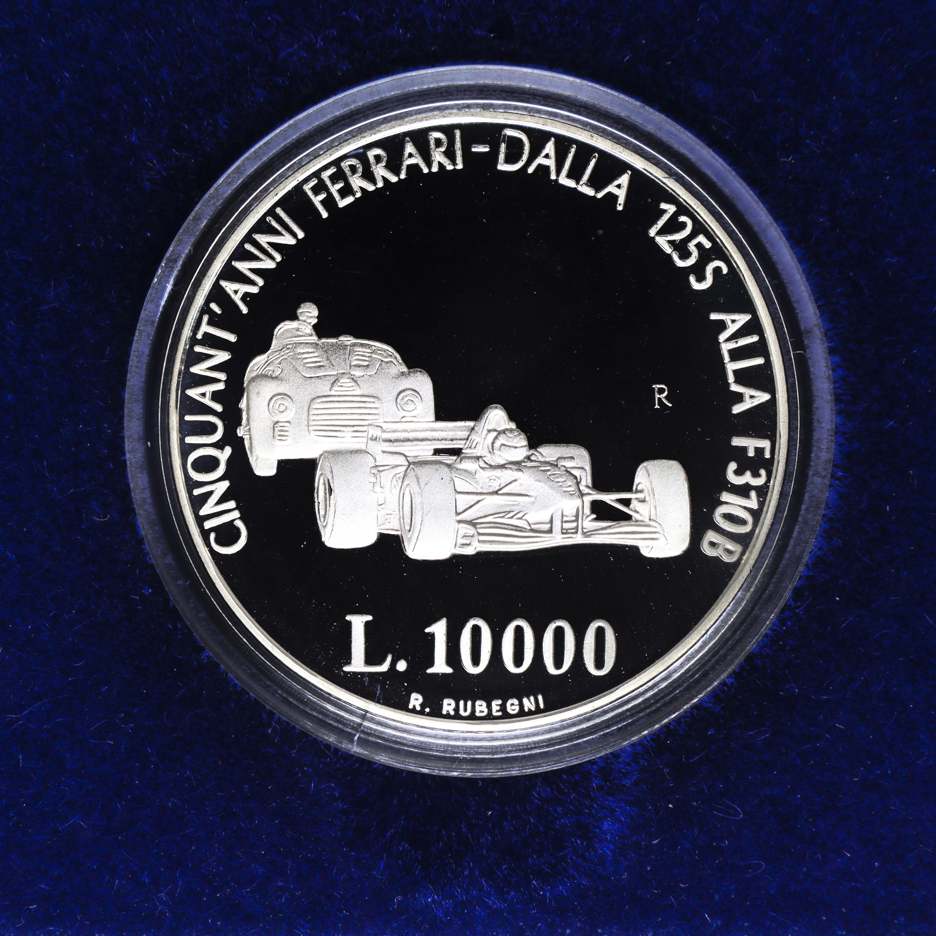 COIN BACK: Two Ferrari 125 SF 310 B models surrounded by the legend "FIFTY YEARS OF FERRARI FROM THE 125 S TO THE F 310 B" L.10000 R. RUBEGNI
